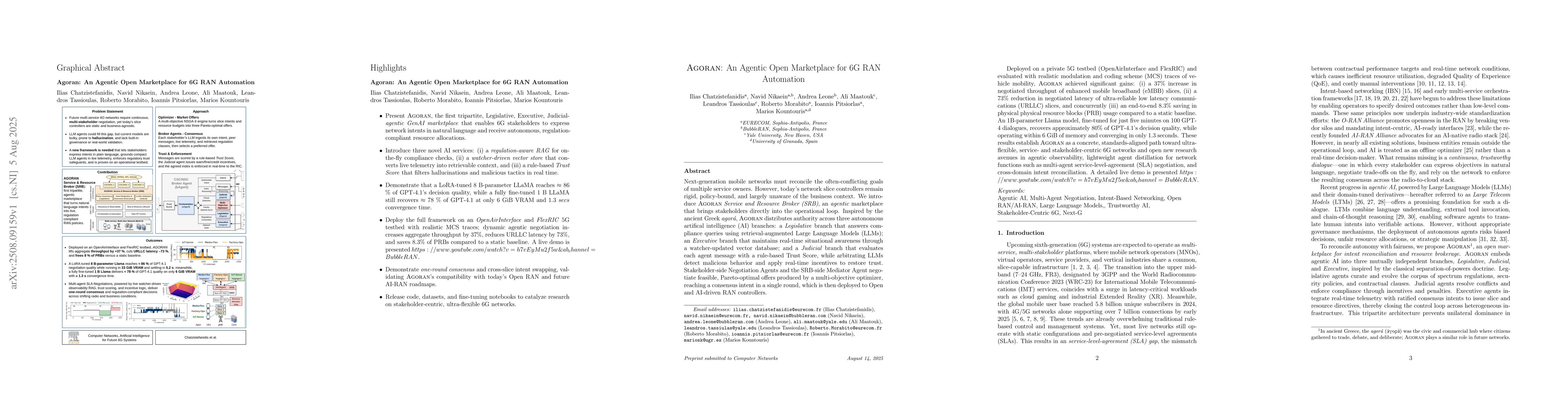 Next-generation mobile networks must reconcile the often-conflicting goals of multiple service owners. However, today's network slice controllers remain rigid, policy-bound, and unaware of the business context. We introduce Agoran Service and Resource Broker (SRB), an agentic marketplace that brings stakeholders directly into the operational loop. Inspired by the ancient Greek agora, Agoran distributes authority across three autonomous AI branches: a Legislative branch that answers compliance queries using retrieval-augmented Large Language Models (LLMs); an Executive branch that maintains real-time situational awareness through a watcher-updated vector database; and a Judicial branch that evaluates each agent message with a rule-based Trust Score, while arbitrating LLMs detect malicious behavior and apply real-time incentives to restore trust. Stakeholder-side Negotiation Agents and the SRB-side Mediator Agent negotiate feasible, Pareto-optimal offers produced by a multi-objective optimizer, reaching a consensus intent in a single round, which is then deployed to Open and AI RAN controllers. Deployed on a private 5G testbed and evaluated with realistic traces of vehicle mobility, Agoran achieved significant gains: (i) a 37% increase in throughput of eMBB slices, (ii) a 73% reduction in latency of URLLC slices, and concurrently (iii) an end-to-end 8.3% saving in PRB usage compared to a static baseline. An 1B-parameter Llama model, fine-tuned for five minutes on 100 GPT-4 dialogues, recovers approximately 80% of GPT-4.1's decision quality, while operating within 6 GiB of memory and converging in only 1.3 seconds. These results establish Agoran as a concrete, standards-aligned path toward ultra-flexible, stakeholder-centric 6G networks. A live demo is presented https://www.youtube.com/watch?v=h7vEyMu2f5w\&ab_channel=BubbleRAN.