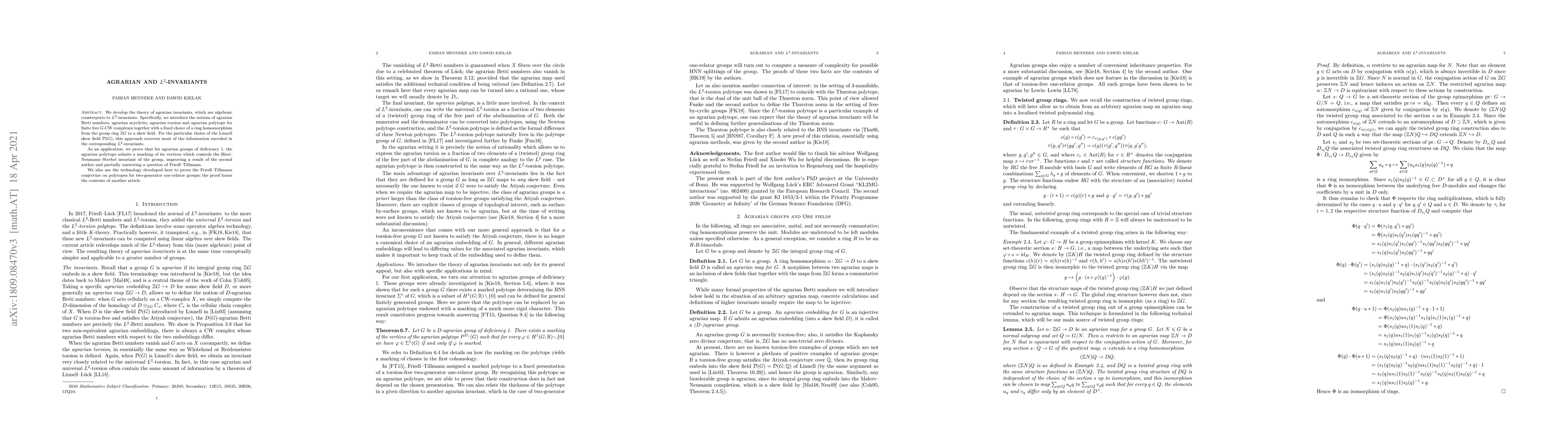 This paper introduces agrarian invariants as algebraic counterparts to $L^2$-invariants, developing concepts like agrarian Betti numbers and polytopes. It shows that agrarian groups of deficiency $1$ can control the Bieri-Neumann-Strebel invariant, and proves the Friedl-Tillmann conjecture for two-generator one-relator groups.