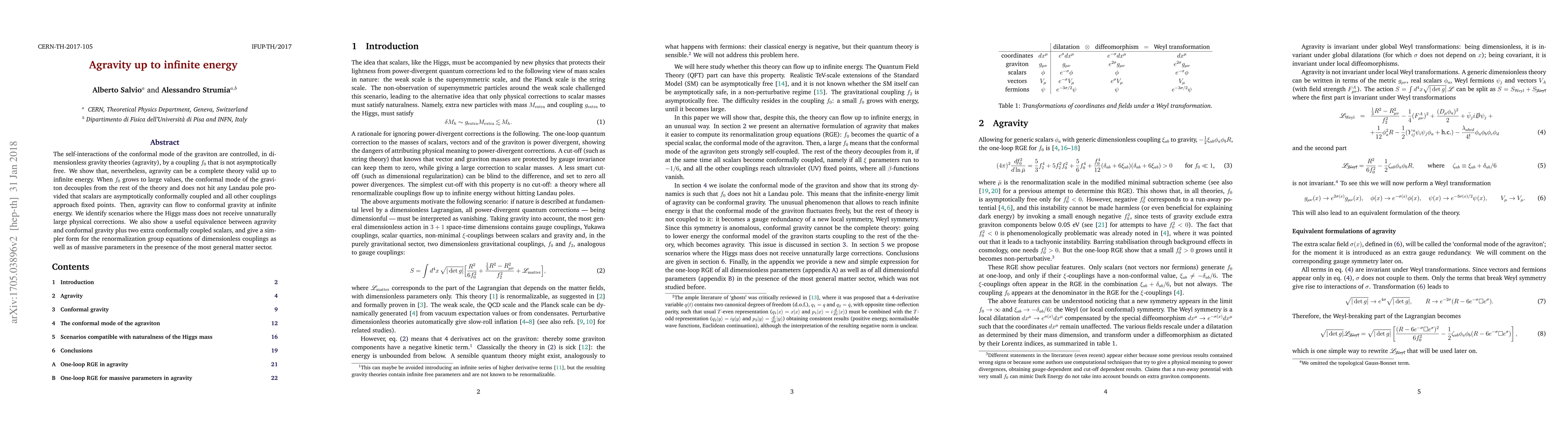 The self-interactions of the conformal mode of the graviton are controlled, in dimensionless gravity theories (agravity), by a coupling $f_0$ that is not asymptotically free. We show that, nevertheless, agravity can be a complete theory valid up to infinite energy. When $f_0$ grows to large values, the conformal mode of the graviton decouples from the rest of the theory and does not hit any Landau pole provided that scalars are asymptotically conformally coupled and all other couplings approach fixed points. Then, agravity can flow to conformal gravity at infinite energy. We identify scenarios where the Higgs mass does not receive unnaturally large physical corrections. We also show a useful equivalence between agravity and conformal gravity plus two extra conformally coupled scalars, and give a simpler form for the renormalization group equations of dimensionless couplings as well as of massive parameters in the presence of the most general matter sector.
