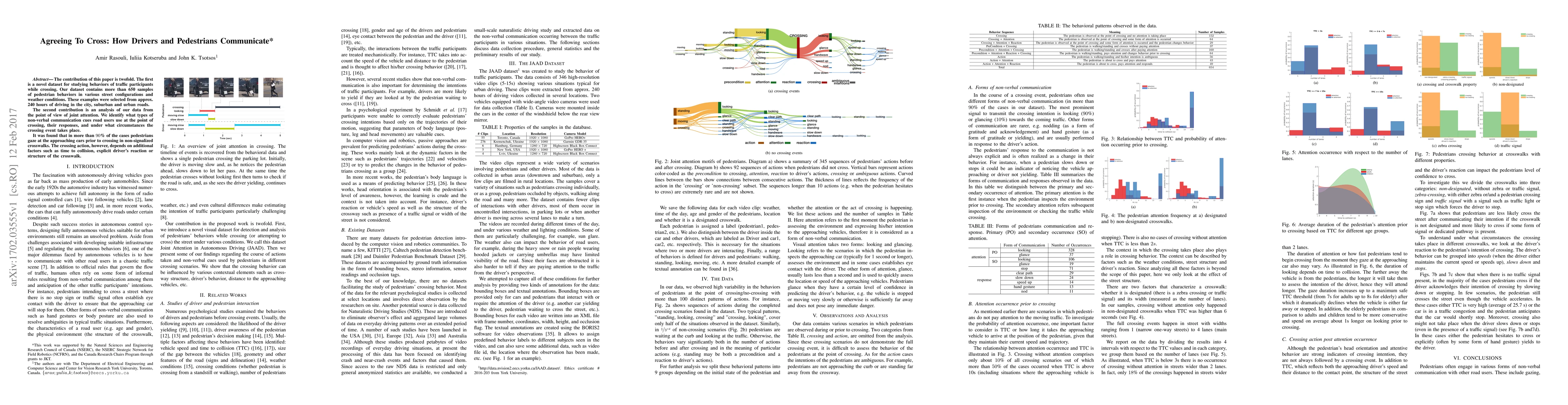 The contribution of this paper is twofold. The first is a novel dataset for studying behaviors of traffic participants while crossing. Our dataset contains more than 650 samples of pedestrian behaviors in various street configurations and weather conditions. These examples were selected from approx. 240 hours of driving in the city, suburban and urban roads. The second contribution is an analysis of our data from the point of view of joint attention. We identify what types of non-verbal communication cues road users use at the point of crossing, their responses, and under what circumstances the crossing event takes place. It was found that in more than 90% of the cases pedestrians gaze at the approaching cars prior to crossing in non-signalized crosswalks. The crossing action, however, depends on additional factors such as time to collision (TTC), explicit driver's reaction or structure of the crosswalk.