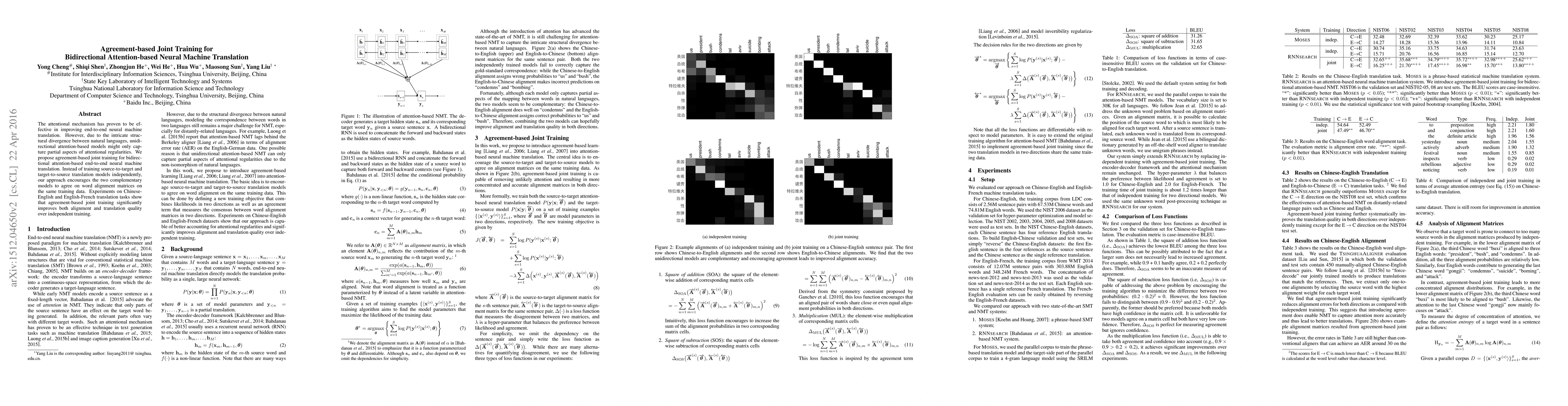 This paper proposes agreement-based joint training for bidirectional attention-based neural machine translation, aiming to improve translation quality by aligning source-to-target and target-to-source models. Experimental results show significant improvements in both alignment and translation quality compared to independent training.