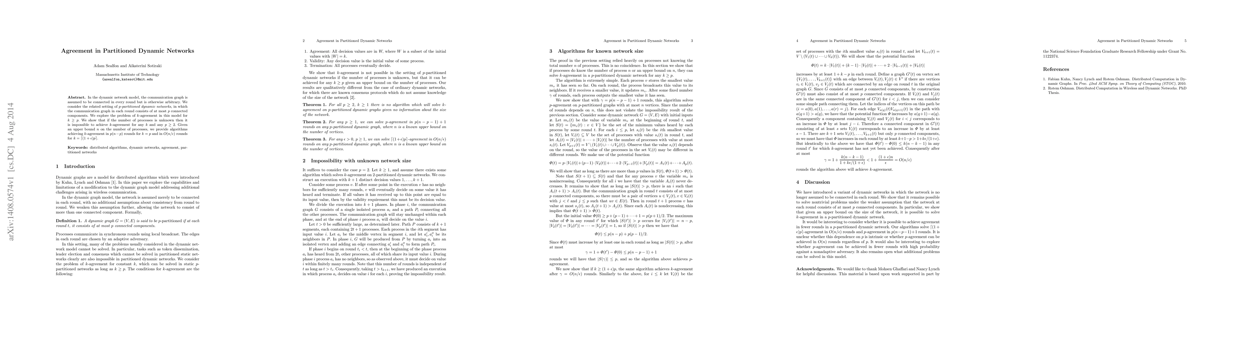The paper presents algorithms for achieving k-agreement in p-partitioned dynamic networks given an upper bound on the number of processes, along with impossibility results when the number of processes is unknown.