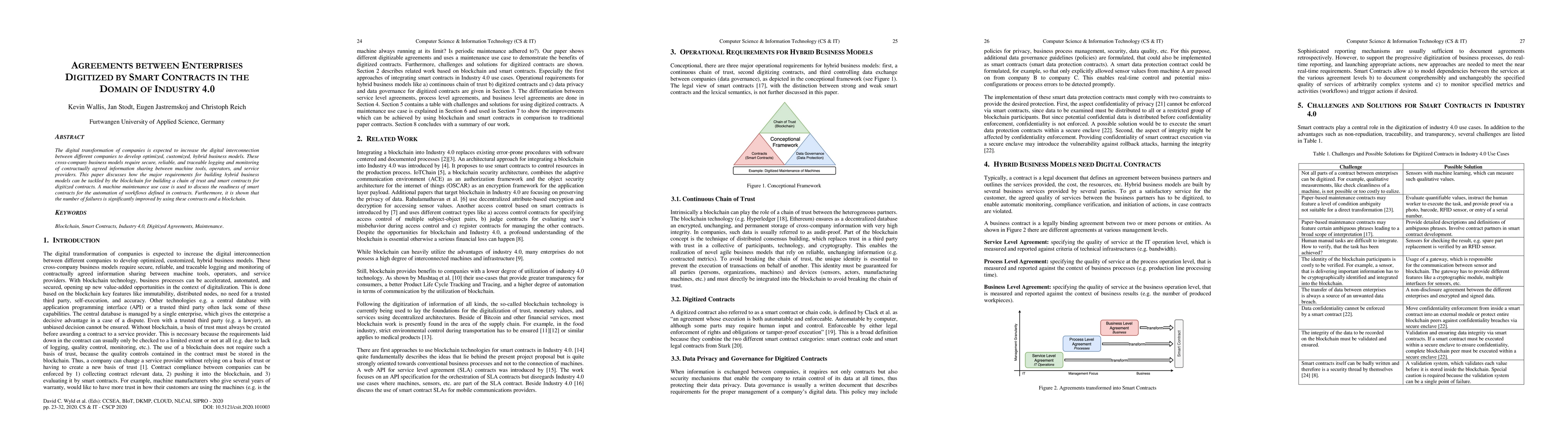 The digital transformation of companies is expected to increase the digital interconnection between different companies to develop optimized, customized, hybrid business models. These cross-company business models require secure, reliable, and traceable logging and monitoring of contractually agreed information sharing between machine tools, operators, and service providers. This paper discusses how the major requirements for building hybrid business models can be tackled by the blockchain for building a chain of trust and smart contracts for digitized contracts. A machine maintenance use case is used to discuss the readiness of smart contracts for the automation of workflows defined in contracts. Furthermore, it is shown that the number of failures is significantly improved by using these contracts and a blockchain.