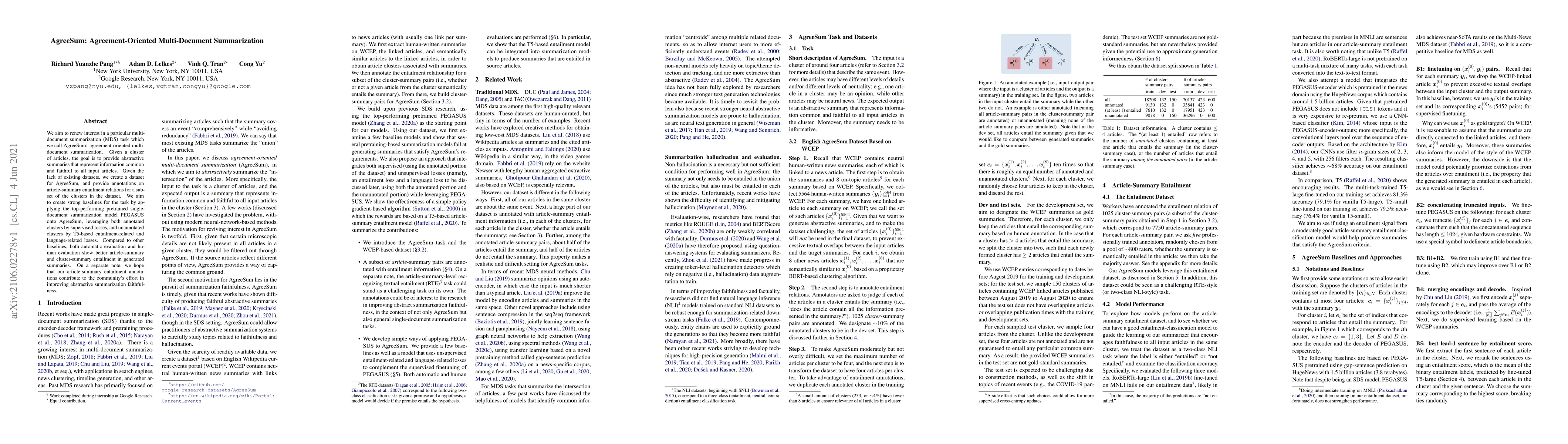 This paper introduces AgreeSum, a novel multi-document summarization task focused on generating summaries that accurately reflect common information across a cluster of articles. The authors create a new dataset and annotations to facilitate this task, applying PEGASUS and other models to achieve better summary entailment compared to existing baselines.