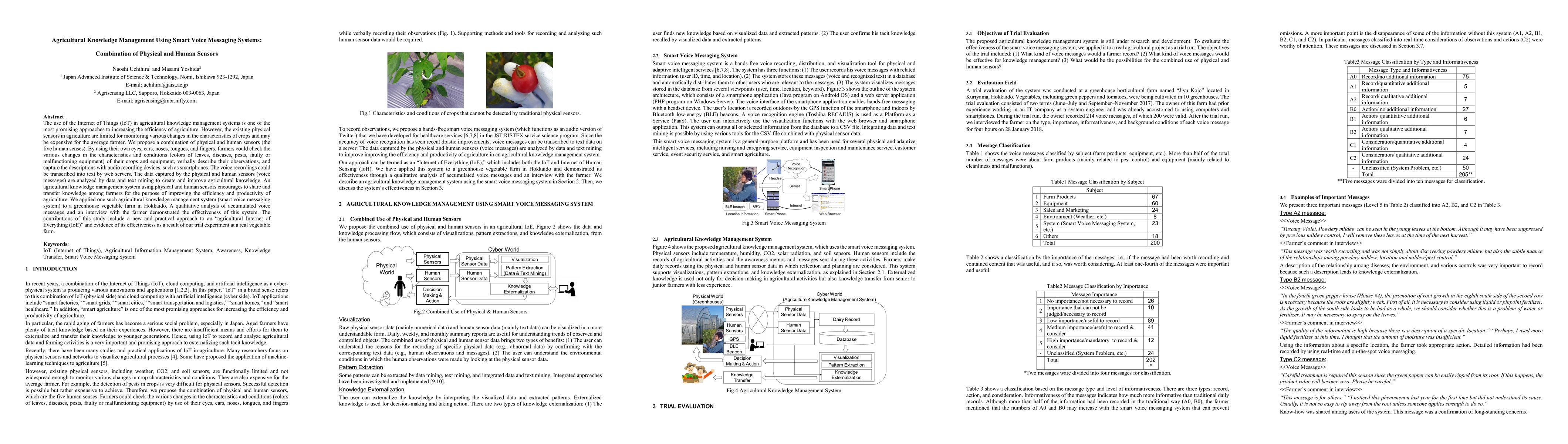 Agricultural knowledge management using smart voice messaging systems combines physical sensors with human senses to improve crop monitoring and efficiency. The system's effectiveness was demonstrated through a trial experiment at a real greenhouse vegetable farm in Hokkaido.