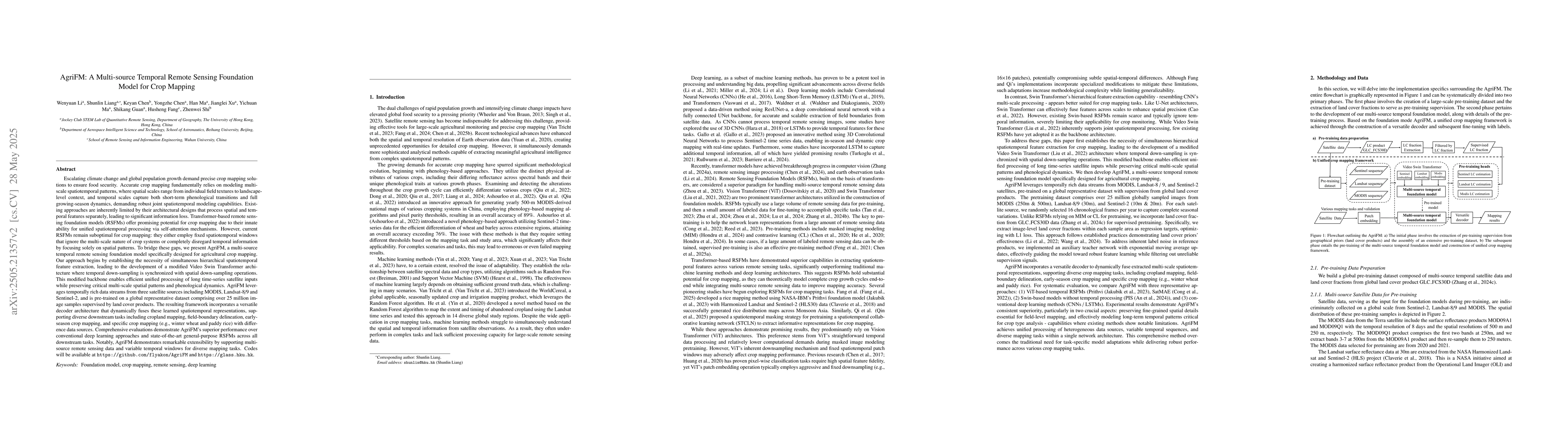 The research introduces AgriFM, a multi-source temporal remote sensing foundation model for crop mapping, utilizing a modified Video Swin Transformer architecture that synchronizes temporal down-sampling with spatial scaling operations. It leverages data from MODIS, Landsat-8/9, and Sentinel-2 satellites, pre-trained on a global dataset of over 25 million image samples supervised by land cover products.