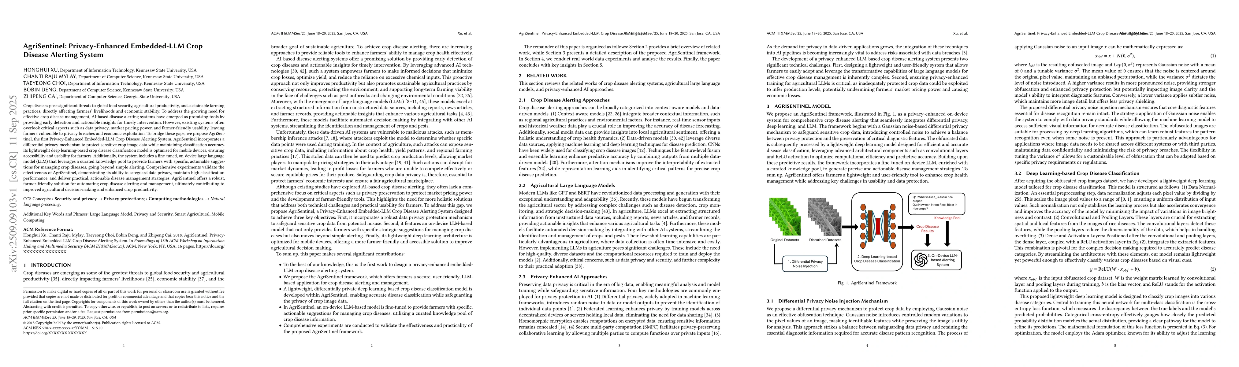 Crop diseases pose significant threats to global food security, agricultural productivity, and sustainable farming practices, directly affecting farmers' livelihoods and economic stability. To address the growing need for effective crop disease management, AI-based disease alerting systems have emerged as promising tools by providing early detection and actionable insights for timely intervention. However, existing systems often overlook critical aspects such as data privacy, market pricing power, and farmer-friendly usability, leaving farmers vulnerable to privacy breaches and economic exploitation. To bridge these gaps, we propose AgriSentinel, the first Privacy-Enhanced Embedded-LLM Crop Disease Alerting System. AgriSentinel incorporates a differential privacy mechanism to protect sensitive crop image data while maintaining classification accuracy. Its lightweight deep learning-based crop disease classification model is optimized for mobile devices, ensuring accessibility and usability for farmers. Additionally, the system includes a fine-tuned, on-device large language model (LLM) that leverages a curated knowledge pool to provide farmers with specific, actionable suggestions for managing crop diseases, going beyond simple alerting. Comprehensive experiments validate the effectiveness of AgriSentinel, demonstrating its ability to safeguard data privacy, maintain high classification performance, and deliver practical, actionable disease management strategies. AgriSentinel offers a robust, farmer-friendly solution for automating crop disease alerting and management, ultimately contributing to improved agricultural decision-making and enhanced crop productivity.