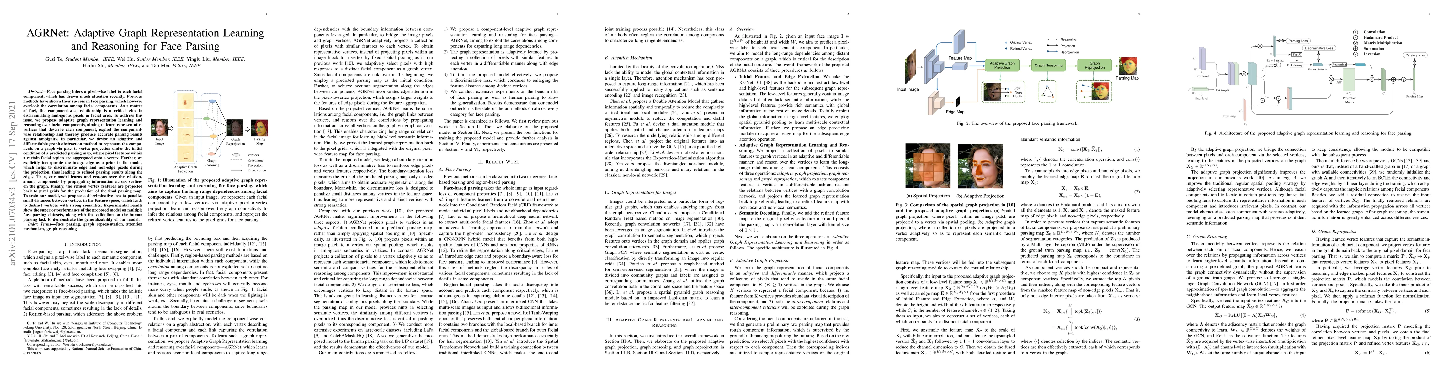 The paper proposes AGRNet, an adaptive graph representation learning and reasoning method for face parsing, which leverages component-wise relationships to improve pixel-wise label inference. The model uses an adaptive graph abstraction method to project facial components onto vertices, incorporating image edges to refine parsing along edges, and employs a discriminative loss to enhance vertex distinctiveness, achieving superior performance on face parsing datasets.