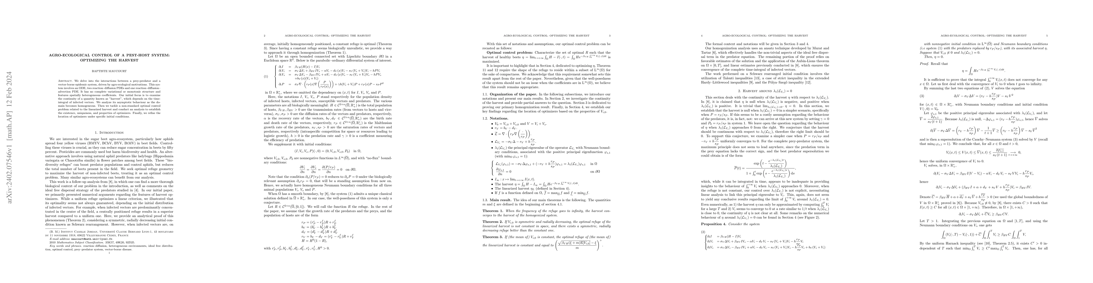We delve into the interactions between a prey-predator and a vector-borne epidemic system, driven by agro-ecological motivations. This system involves an ODE, two reaction--diffusion PDEs and one reaction--diffusion--advection PDE. It has no complete variational or monotonic structure and features spatially heterogeneous coefficients. Our initial focus is to examine the continuity of a quantity known as ''harvest'', which depends on the time-integral of infected vectors. We analyze its asymptotic behaviour as the domain becomes homogeneous. Then we tackle a non-standard optimal control problem related to the linearized harvest and conduct an analysis to establish the existence, uniqueness, and properties of optimizers. Finally, we refine the location of optimizers under specific initial conditions.