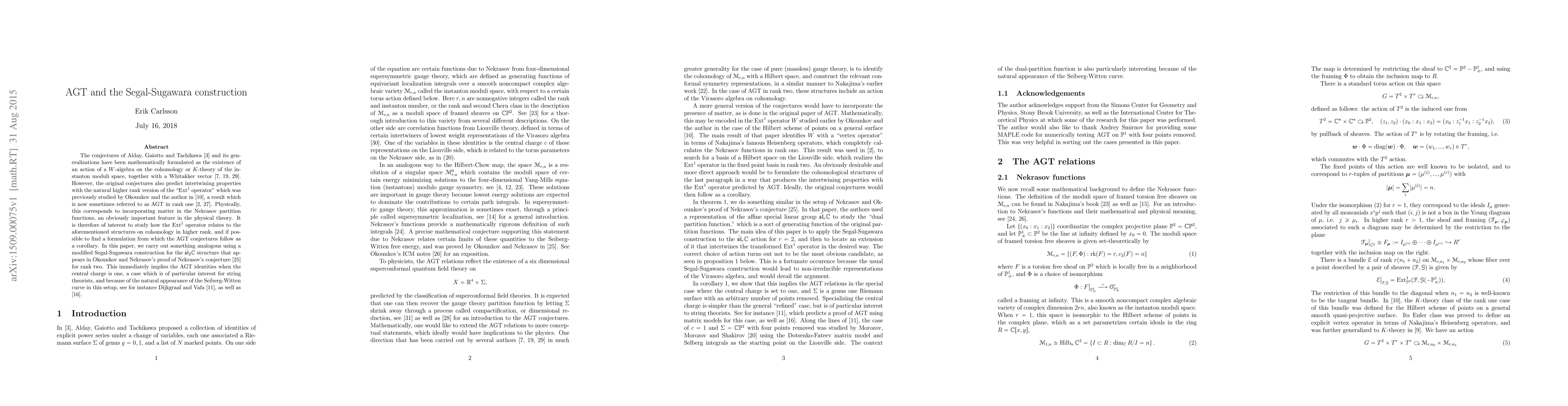 The conjectures of Alday, Gaiotto and Tachikawa and its generalizations have been mathematically formulated as the existence of an action of a $W$-algebra on the cohomology or $K$-theory of the instanton moduli space, together with a Whitakker vector. However, the original conjectures also predict intertwining properties with the natural higher rank version of the "$Ext^1$ operator" which was previously studied by Okounkov and the author in [CO], a result which is now sometimes referred to as AGT in rank one [Alb,PSS]. Physically, this corresponds to incorporating matter in the Nekrasov partition functions, an obviously important feature in the physical theory. It is therefore of interest to study how the $Ext^1$ operator relates to the aforementioned structures on cohomology in higher rank, and if possible to find a formulation from which the AGT conjectures follow as a corollary. In this paper, we carry out something analogous using a modified Segal-Sugawara construction for the $\hat{\mathfrak{sl}}_2\mathbb{C}$ structure that appears in Okounkov and Nekrasov's proof of Nekrasov's conjecture [NO] for rank two. This immediately implies the AGT identities when the central charge is one, a case which is of particular interest for string theorists, and because of the natural appearance of the Seiberg-Witten curve in this setup, see for instance Dijkgraaf and Vafa [DV], as well as [IKV].