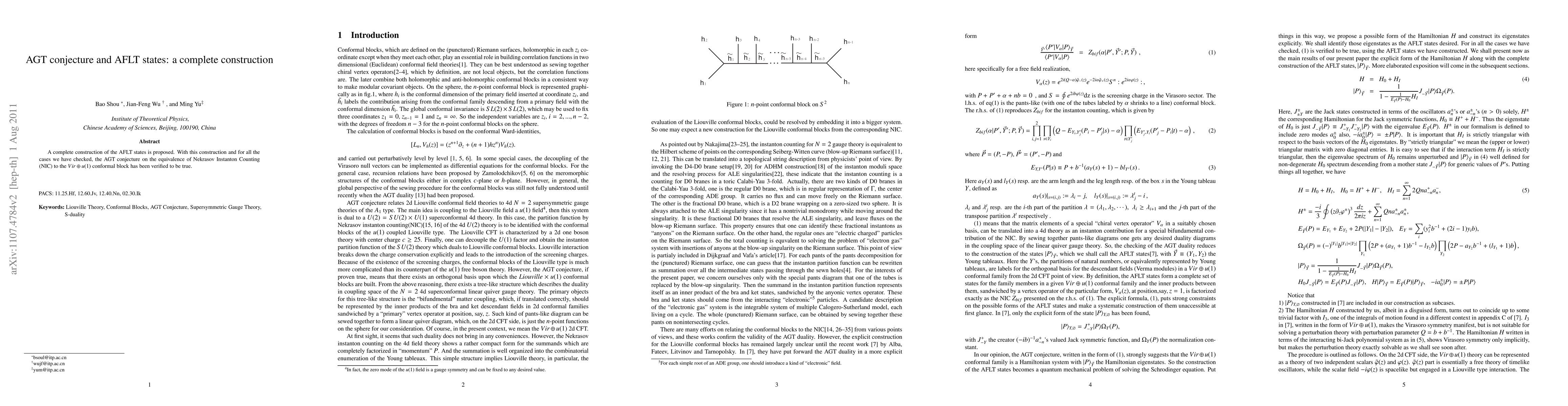 A complete construction of the AFLT states is proposed. With this construction and for all the cases we have checked, the AGT conjecture on the equivalence of Nekrasov Instanton Counting (NIC) to the $Vir\oplus u(1)$ conformal block has been verified to be true.