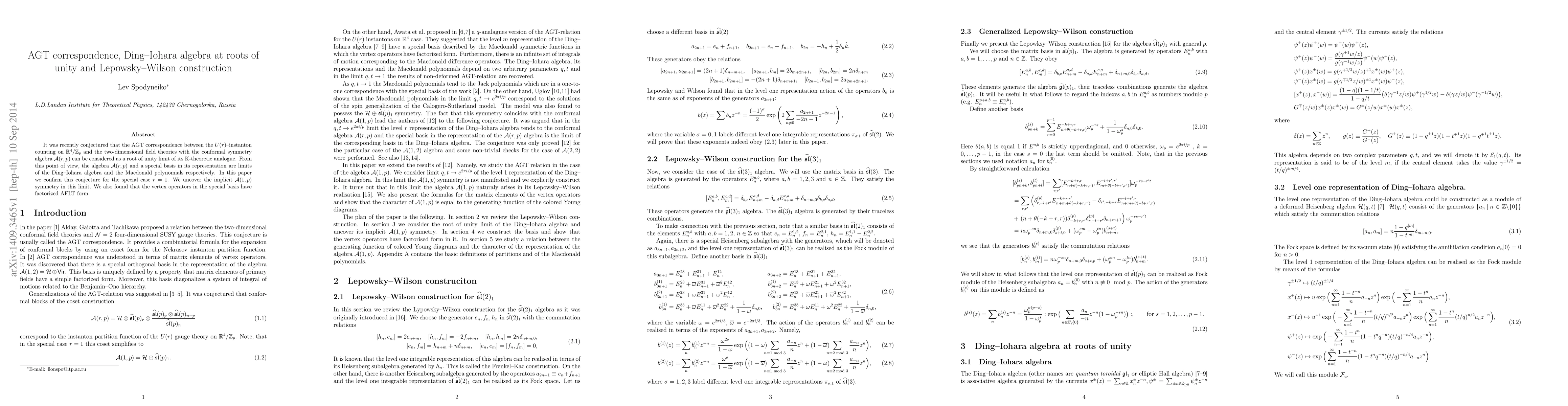 It was recently conjectured that the AGT correspondence between the $U(r)$-instanton counting on $\mathbb R^4/\mathbb Z_p$ and the two-dimensional field theories with the conformal symmetry algebra $\mathcal A(r,p)$ can be considered as a root of unity limit of its K-theoretic analogue. From this point of view, the algebra $\mathcal A(r,p)$ and a special basis in its representation are limits of the Ding-Iohara algebra and the Macdonald polynomials respectively. In this paper we confirm this conjecture for the special case $r=1$. We uncover the implicit $\mathcal A(1,p)$ symmetry in this limit. We also found that the vertex operators in the special basis have factorized AFLT form.