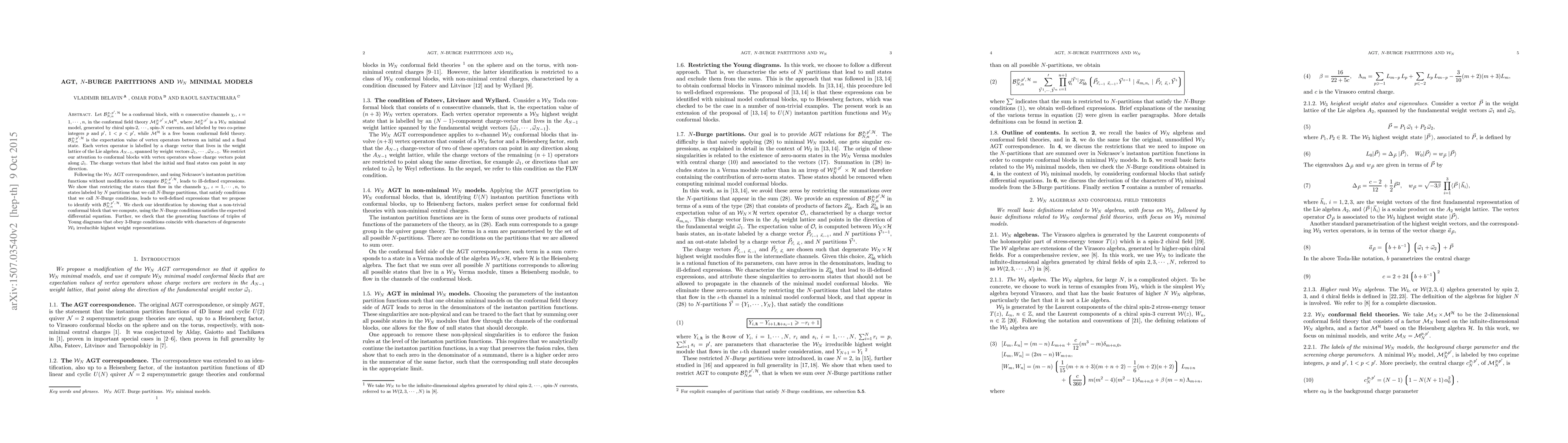 Let ${\mathcal B}^{\, p, \, p^{\prime}, \, {\mathcal H}}_{N, n}$ be a conformal block, with $n$ consecutive channels $\chi_{\i}$, $\i = 1, \cdots, n$, in the conformal field theory $\mathcal{M}^{\, p, \, p^{\prime}}_N \! \times \! \mathcal{M}^{\mathcal{H}}$, where $\mathcal{M}^{\, p, \, p^{\prime}}_N$ is a $\mathcal{W}_N$ minimal model, generated by chiral fields of spin $1, \cdots, N$, and labeled by two co-prime integers $p$ and $p^{\prime}$, $1 < p < p^{\prime}$, while $\mathcal{M}^{\mathcal{H}}$ is a free boson conformal field theory. $\mathcal{B}^{\, p, \, p^{\prime}, \mathcal{H}}_{N, n}$ is the expectation value of vertex operators between an initial and a final state. Each vertex operator is labelled by a charge vector that lives in the weight lattice of the Lie algebra $A_{N-1}$, spanned by weight vectors $\omega_1, \cdots, \omega_{N-1}$. We restrict our attention to conformal blocks with vertex operators whose charge vectors point along $\omega_1$. The charge vectors that label the initial and final states can point in any direction. Following the $\mathcal{W}_N$ AGT correspondence, and using Nekrasov's instanton partition functions without modification, to compute $\mathcal{B}^{\, p, \, p^{\prime}, \mathcal{H}}_{N, n}$, leads to ill-defined expressions. We show that restricting the states that flow in the channels $\chi_{\i}$, $\i = 1, \cdots, n$, to states labeled by $N$ partitions that satisfy conditions that we call $N$-Burge partitions, leads to well-defined expressions that we identify with $\mathcal{B}^{\, p, \, p^{\prime}, \, \mathcal{H}}_{N, n}$. We check our identification by showing that a specific non-trivial conformal block that we compute, using the $N$-Burge conditions satisfies the expected differential equation.