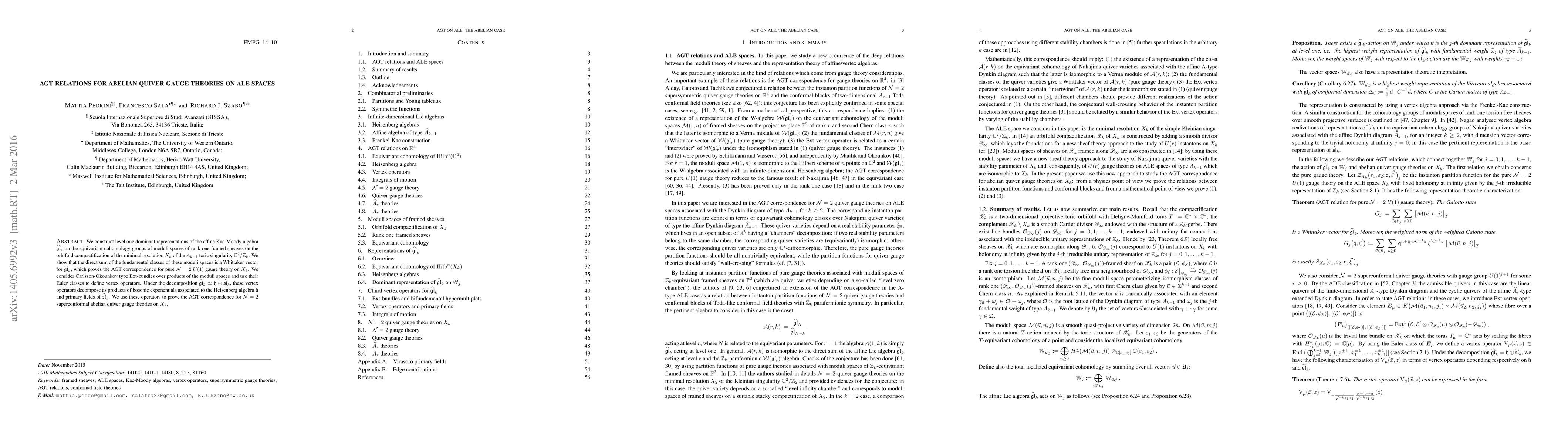 This paper constructs level one dominant representations of $\widehat{\mathfrak{gl}}_k$ on equivariant cohomology groups of moduli spaces on ALE spaces, proving the AGT correspondence for pure $\mathcal{N}=2$ $U(1)$ gauge theory and $\mathcal{N}=2$ superconformal abelian quiver gauge theories.