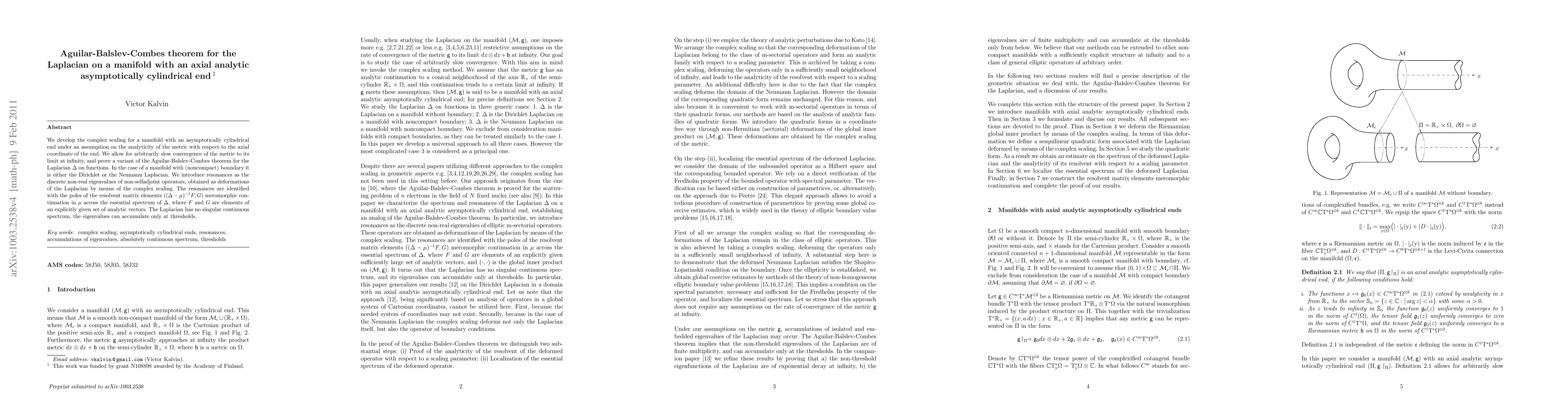 We develop the complex scaling for a manifold with an asymptotically cylindrical end under an assumption on the analyticity of the metric with respect to the axial coordinate of the end. We allow for arbitrarily slow convergence of the metric to its limit at infinity, and prove a variant of the Aguilar-Balslev-Combes theorem for the Laplacian $\Delta$ on functions. In the case of a manifold with (noncompact) boundary it is either the Dirichlet or the Neumann Laplacian. We introduce resonances as the discrete non-real eigenvalues of non-selfadjoint operators, obtained as deformations of the Laplacian by means of the complex scaling. The resonances are identified with the poles of the resolvent matrix elements $((\Delta-\mu)^{-1}F, G)$ meromorphic continuation in $\mu$ across the essential spectrum of $\Delta$, where $F$ and $G$ are elements of an explicitly given set of analytic vectors. The Laplacian has no singular continuous spectrum, the eigenvalues can accumulate only at thresholds.