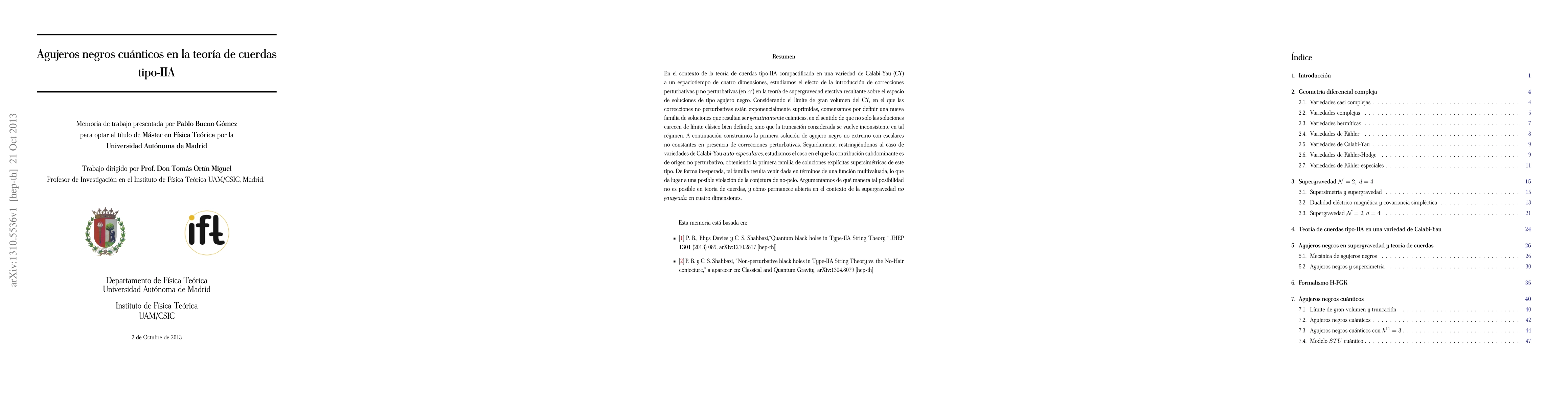 In the context of Type-IIA String Theory compactified to four dimensions on a Calabi-Yau manifold (CY), we study the effect of considering perturbative and non-perturbative corrections (in alpha prime) to the prepotential of the resulting effective Supergravity theory on the space of black hole solutions. Considering the large volume limit of the CY, in which the non-perturbative corrections are exponentially suppressed, we define a new class of solutions which turn out to be genuinely quantum, in the sense that not only their classical limit is not well defined, but also the truncation under consideration becomes inconsistent in such a limit. Next, we construct the first non-extremal black hole solution with non-constant scalars in the presence of perturbative corrections. Right after, restricting ourselves to the case of self-mirror CY, we study the case in which the sub-dominant contribution has a non-perturbative origin, obtaining the first family of explicit supersymmetric solutions of this kind. Surprisingly enough, these solutions turn out to involve multivalued functions, which opens the door for a possible violation of the No-Hair conjecture. We discuss how this cannot be accomplished in our String Theory set up, but how the possibility remains open in the context of N=2, d=4 ungauged Supergravity. Fully in Spanish.