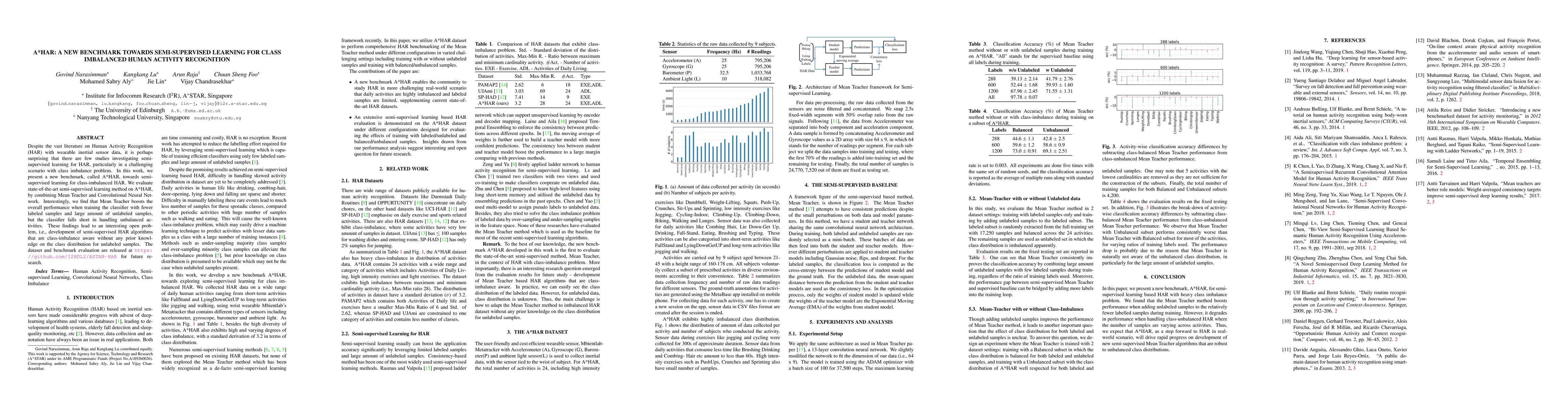 Despite the vast literature on Human Activity Recognition (HAR) with wearable inertial sensor data, it is perhaps surprising that there are few studies investigating semisupervised learning for HAR, particularly in a challenging scenario with class imbalance problem. In this work, we present a new benchmark, called A*HAR, towards semisupervised learning for class-imbalanced HAR. We evaluate state-of-the-art semi-supervised learning method on A*HAR, by combining Mean Teacher and Convolutional Neural Network. Interestingly, we find that Mean Teacher boosts the overall performance when training the classifier with fewer labelled samples and a large amount of unlabeled samples, but the classifier falls short in handling unbalanced activities. These findings lead to an interesting open problem, i.e., development of semi-supervised HAR algorithms that are class-imbalance aware without any prior knowledge on the class distribution for unlabeled samples. The dataset and benchmark evaluation are released at https://github.com/I2RDL2/ASTAR-HAR for future research.