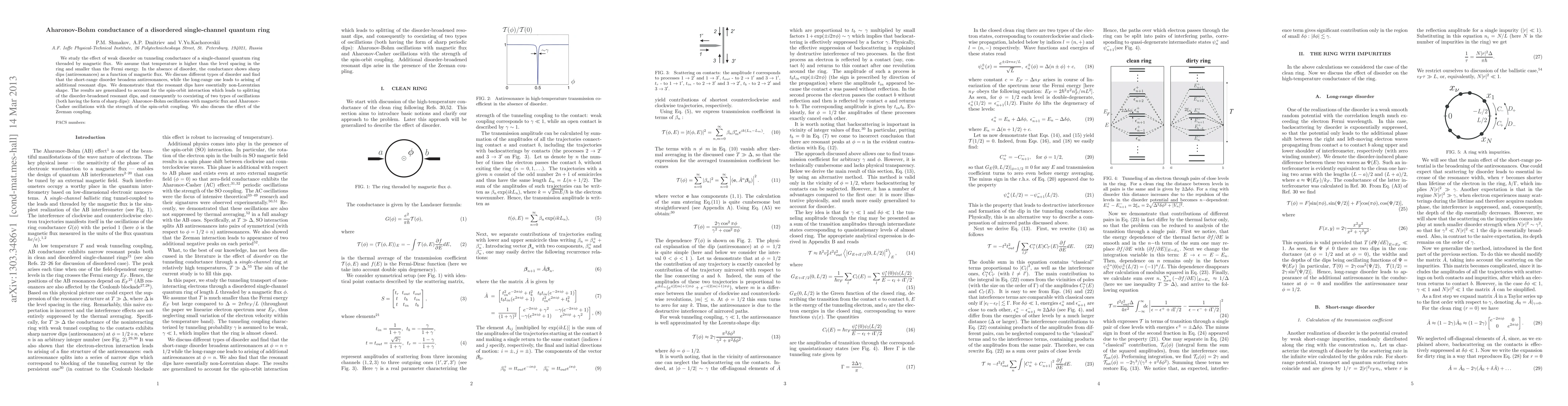 This paper investigates how weak disorder affects the tunneling conductance in a single-channel quantum ring, revealing that short-range disorder broadens antiresonances while long-range disorder introduces additional resonant dips. The study also explores the impact of spin-orbit interaction and Zeeman coupling, leading to coexisting Aharonov-Bohm and Aharonov-Casher oscillations.