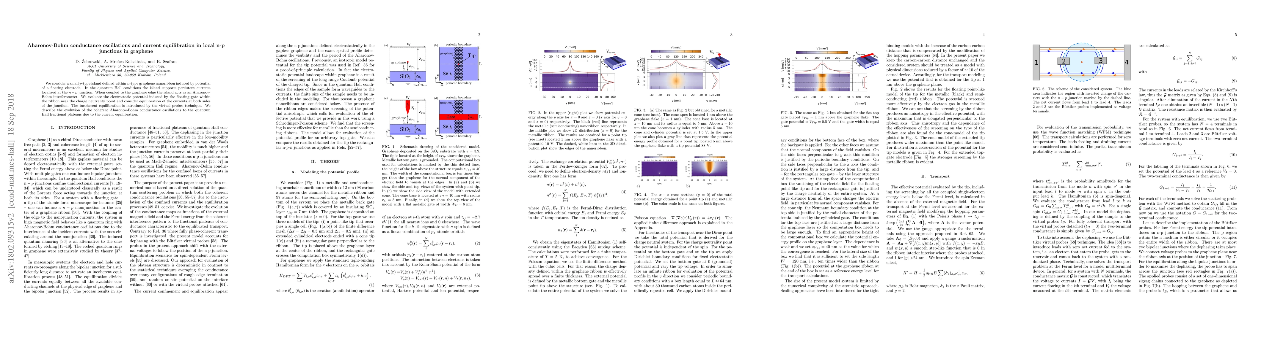 This paper investigates Aharonov-Bohm oscillations in local n-p junctions in graphene, revealing how persistent currents localized at the junction evolve into quantum Hall fractional plateaus through current equilibration mechanisms introduced by virtual probes. The study highlights the role of a floating electrode in inducing electrostatic potential and its effect on conductance oscillations.