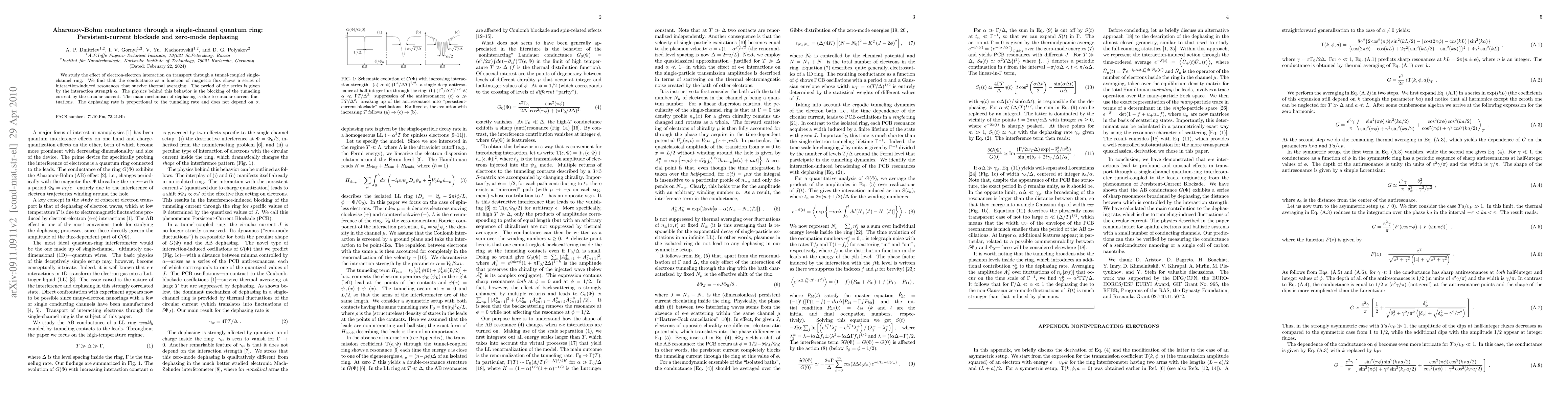 We study the effect of electron-electron interaction on transport through a tunnel-coupled single-channel ring. We find that the conductance as a function of magnetic flux shows a series of interaction-induced resonances that survive thermal averaging. The period of the series is given by the interaction strength $\alpha$. The physics behind this behavior is the blocking of the tunneling current by the circular current. The main mechanism of dephasing is due to circular-current fluctuations. The dephasing rate is proportional to the tunneling rate and does not depend on $\alpha$.