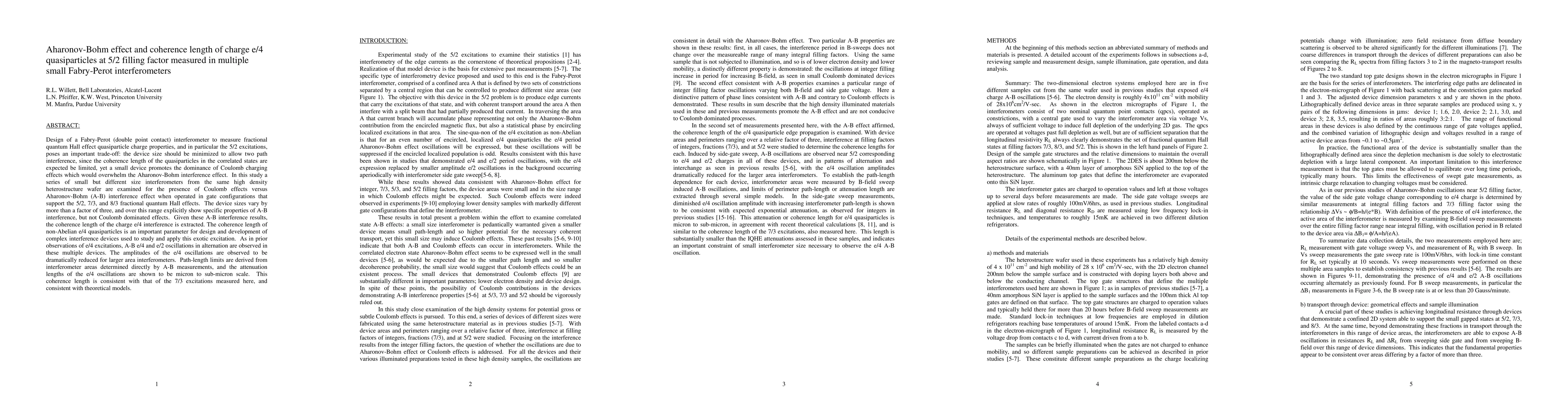 This paper investigates the Aharonov-Bohm effect in multiple small Fabry-Perot interferometers designed to study the coherence length of charge e/4 quasiparticles at the 5/2 filling factor in fractional quantum Hall systems. The study finds that while Coulomb effects are minimized, the coherence length of these quasiparticles is on the micron to sub-micron scale, consistent with theoretical models.