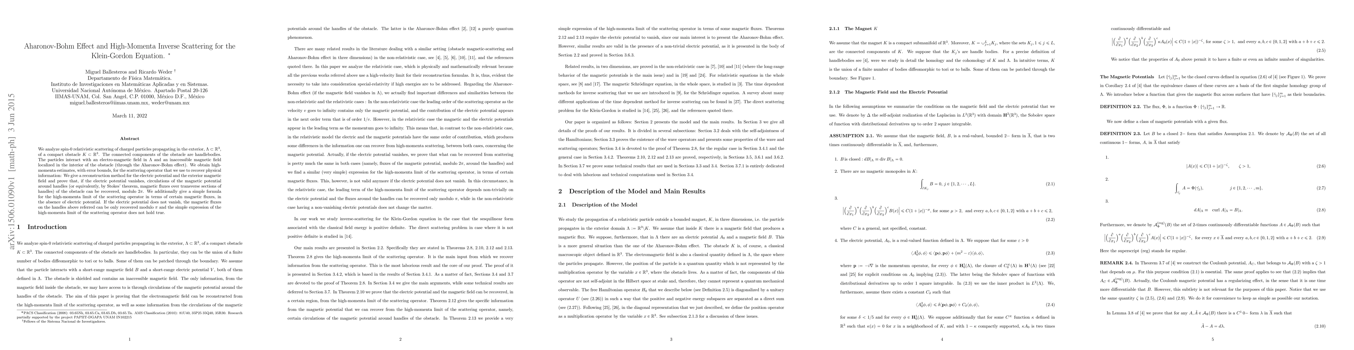 We analyze spin-0 relativistic scattering of charged particles propagating in the exterior, $\Lambda \subset \mathbb{R}^3$, of a compact obstacle $K \subset \mathbb{R}^3$. The connected components of the obstacle are handlebodies. The particles interact with an electro-magnetic field in $\Lambda$ and an inaccessible magnetic field localized in the interior of the obstacle (through the Aharonov-Bohm effect). We obtain high-momenta estimates, with error bounds, for the scattering operator that we use to recover physical information: We give a reconstruction method for the electric potential and the exterior magnetic field and prove that, if the electric potential vanishes, circulations of the magnetic potential around handles (or equivalently, by Stokes' theorem, magnetic fluxes over transverse sections of handles) of the obstacle can be recovered, modulo $2 \pi$. We additionally give a simple formula for the high-momenta limit of the scattering operator in terms of certain magnetic fluxes, in the absence of electric potential. If the electric potential does not vanish, the magnetic fluxes on the handles above referred can be only recovered modulo $\pi$ and the simple expression of the high-momenta limit of the scattering operator does not hold true.