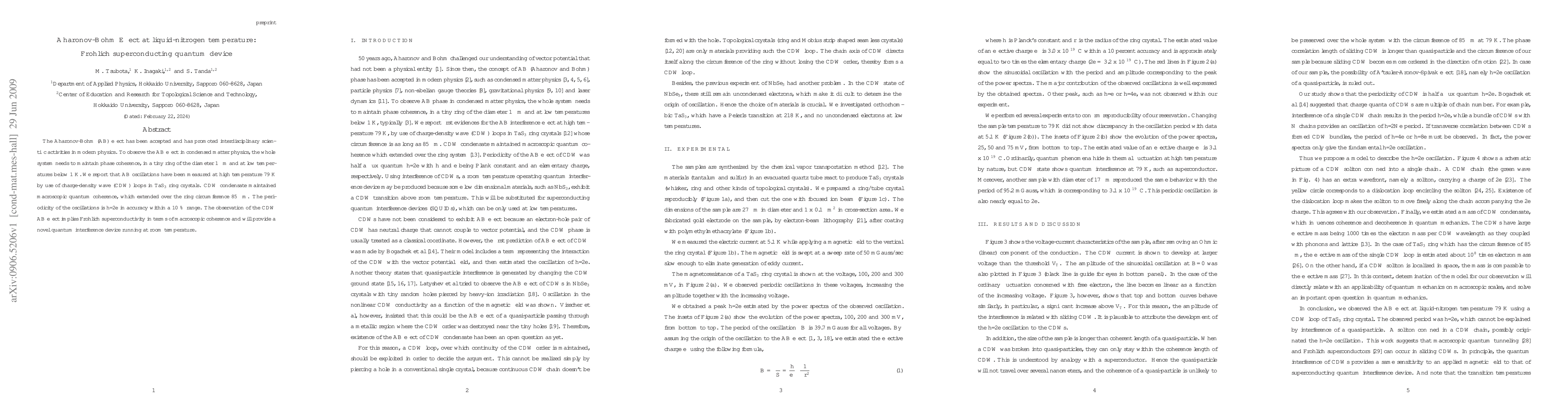 This paper reports the observation of the Aharonov-Bohm effect at 79 K in TaS3 ring crystals using charge-density wave loops, demonstrating macroscopic quantum coherence and periodicity of h/2e, suggesting Frohlich superconductivity and potential for room-temperature quantum interference devices.