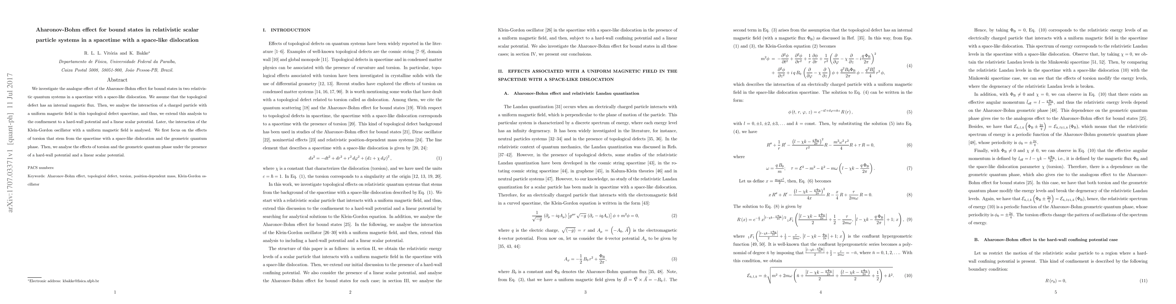 This research explores the Aharonov-Bohm effect analogue in relativistic quantum systems with a space-like dislocation, considering a topological defect with an internal magnetic flux. It extends the analysis to systems confined by hard-wall and linear scalar potentials, examining the Klein-Gordon oscillator in a magnetic field and the influence of torsion and geometric quantum phase.