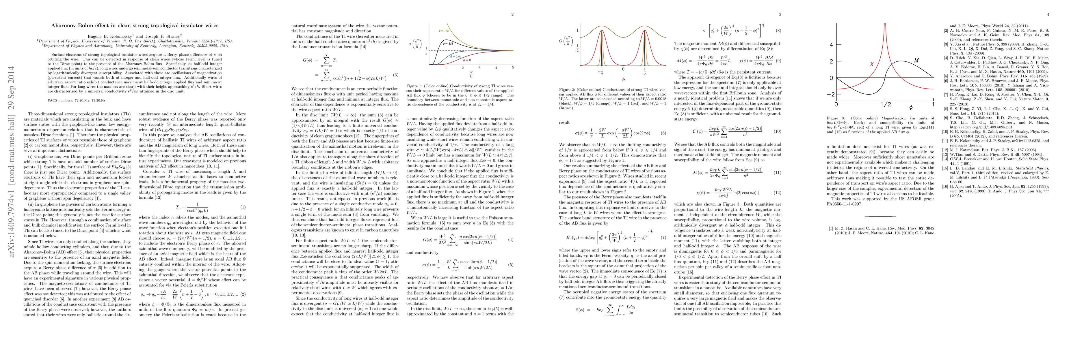 The research explores the Aharonov-Bohm effect in strong topological insulator wires, revealing that surface electrons gain a $pi$ Berry phase upon circling the wire. This leads to semimetal-semiconductor transitions at half-odd integer flux, causing logarithmically divergent susceptibility and persistent current oscillations that vanish at both integer and half-odd integer flux. Long wires display sharp conductance maxima at half-odd integer flux and minima at integer flux, while short wires exhibit a universal conductivity of $e^{2}/pi h$ in the disc limit.