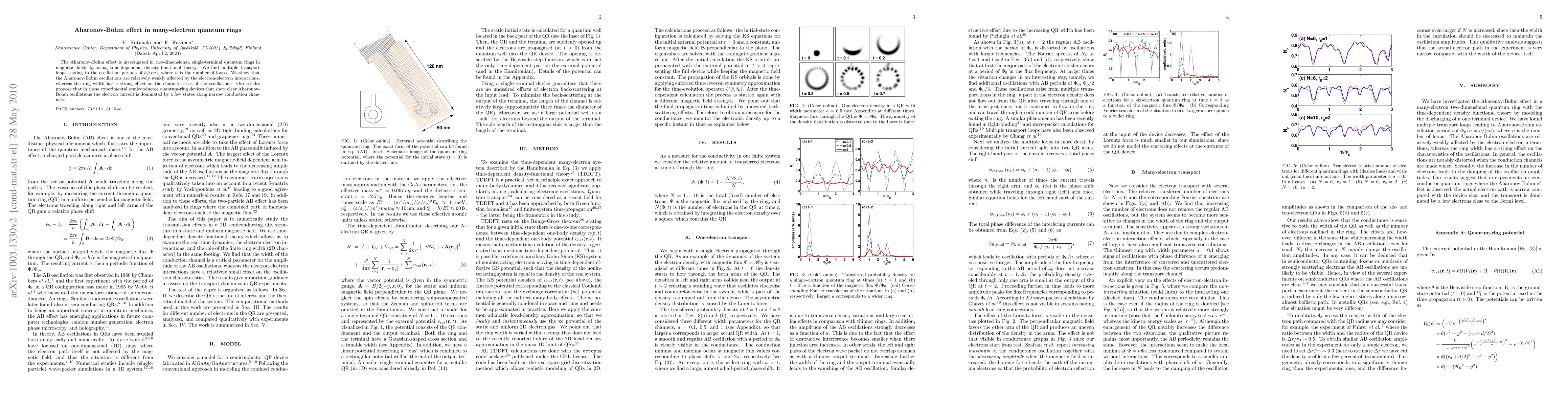 This study investigates the Aharonov-Bohm effect in quantum rings using time-dependent density-functional theory, revealing multiple transport loops with oscillation periods of h/(en). The research finds that electron-electron interactions have a minor impact, while ring width significantly influences oscillation characteristics, suggesting that current in quantum-ring devices is mainly carried by a few states in narrow channels.