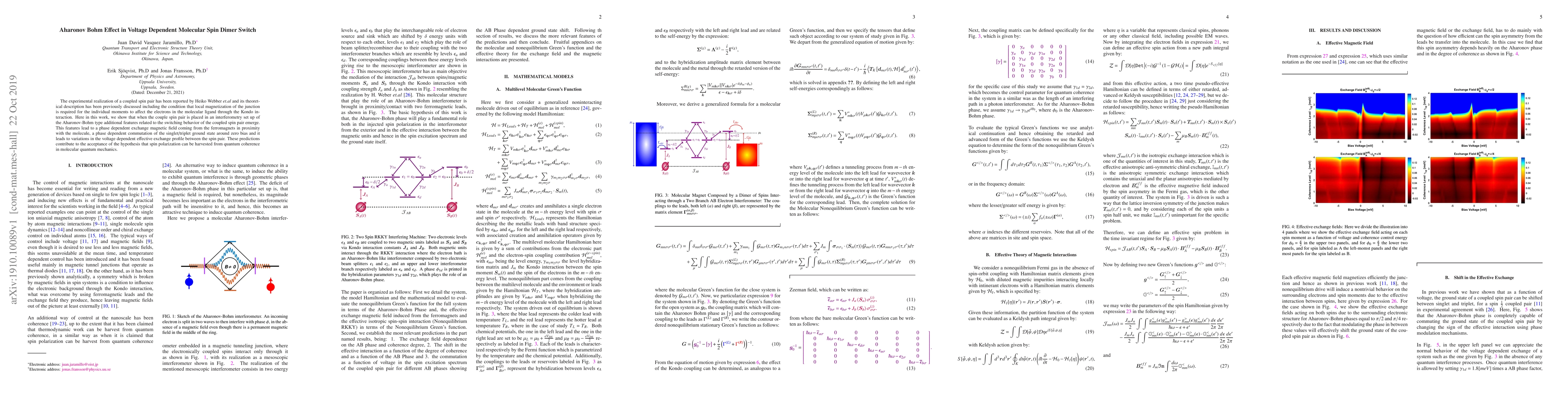 The experimental realization of a coupled spin pair has been reported by Heiko Webber et.al and its theoretical description has been previously discussed including the condition that local magnetization of the junction is required for the individual moments to affect the electrons in the molecular ligand through the Kondo interaction. Here in this work, we show that when the couple spin pair is placed in an interferometry set up of the Aharonov-Bohm type additional features related to the switching behavior of the coupled spin pair emerge. This features lead to a phase dependent exchange magnetic field coming from the ferromagnets in proximity with the molecule, a phase dependent commutation of the singlet/triplet ground state around zero bias and it leads to variations in the voltage dependent effective exchange profile between the spin pair. These predictions contribute to the acceptance of the hypothesis that spin polarization can be harvested from quantum coherence in molecular quantum mechanics