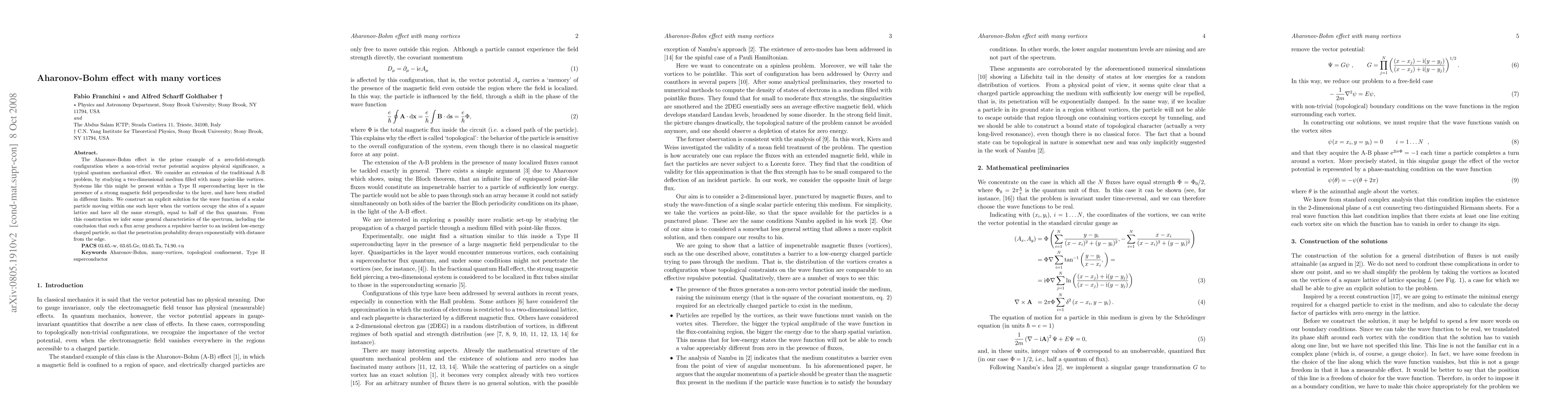 The Aharonov-Bohm effect is the prime example of a zero-field-strength configuration where a non-trivial vector potential acquires physical significance, a typical quantum mechanical effect. We consider an extension of the traditional A-B problem, by studying a two-dimensional medium filled with many point-like vortices. Systems like this might be present within a Type II superconducting layer in the presence of a strong magnetic field perpendicular to the layer, and have been studied in different limits. We construct an explicit solution for the wave function of a scalar particle moving within one such layer when the vortices occupy the sites of a square lattice and have all the same strength, equal to half of the flux quantum. From this construction we infer some general characteristics of the spectrum, including the conclusion that such a flux array produces a repulsive barrier to an incident low-energy charged particle, so that the penetration probability decays exponentially with distance from the edge.
