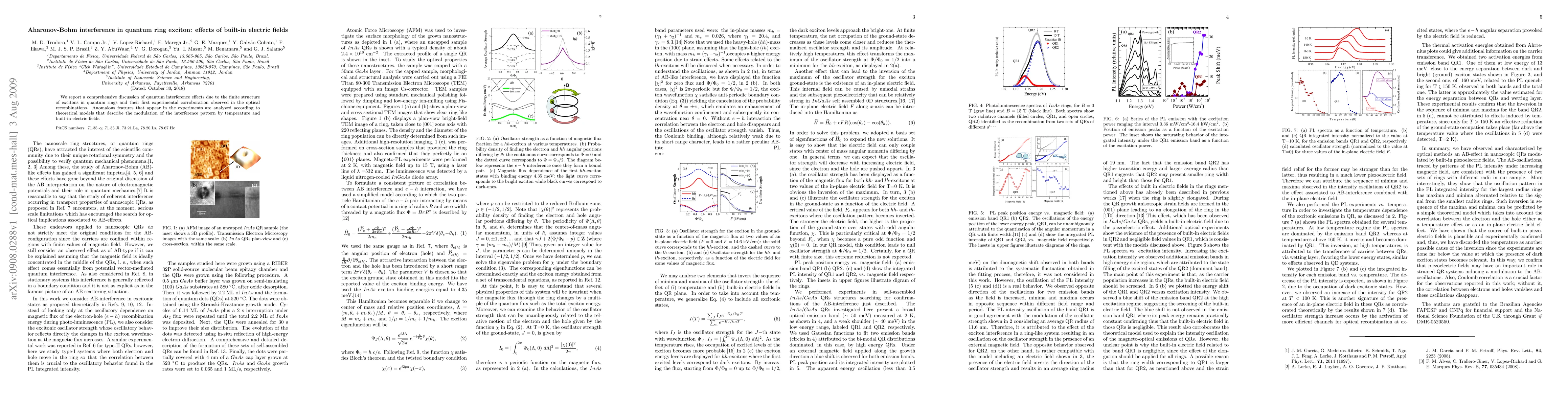 We report a comprehensive discussion of quantum interference effects due to the finite structure of excitons in quantum rings and their first experimental corroboration observed in the optical recombinations. Anomalous features that appear in the experiments are analyzed according to theoretical models that describe the modulation of the interference pattern by temperature and built-in electric fields.