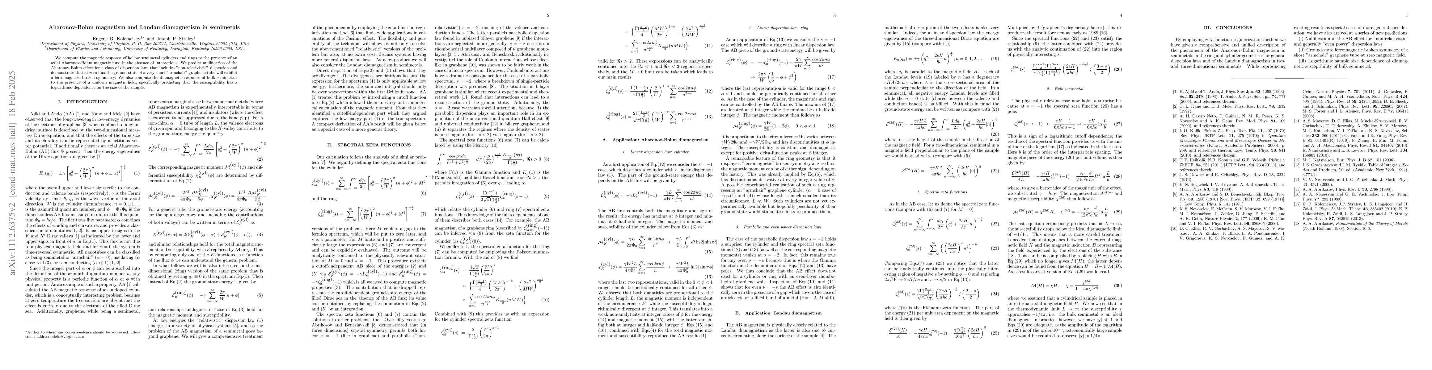 We compute the magnetic response of hollow semimetal cylinders and rings to the presence of an axial Aharonov-Bohm magnetic flux, in the absence of interactions. We predict nullification of the Aharonov-Bohm effect for a class of dispersion laws that includes "non-relativistic" dispersion and demonstrate that at zero flux the ground-state of a very short "armchair" graphene tube will exhibit a ferromagnetic broken symmetry. We also compute the diamagnetic response of bulk semimetals to the presence of a uniform magnetic field, specifically predicting that the susceptibility has a logarithmic dependence on the size of the sample.