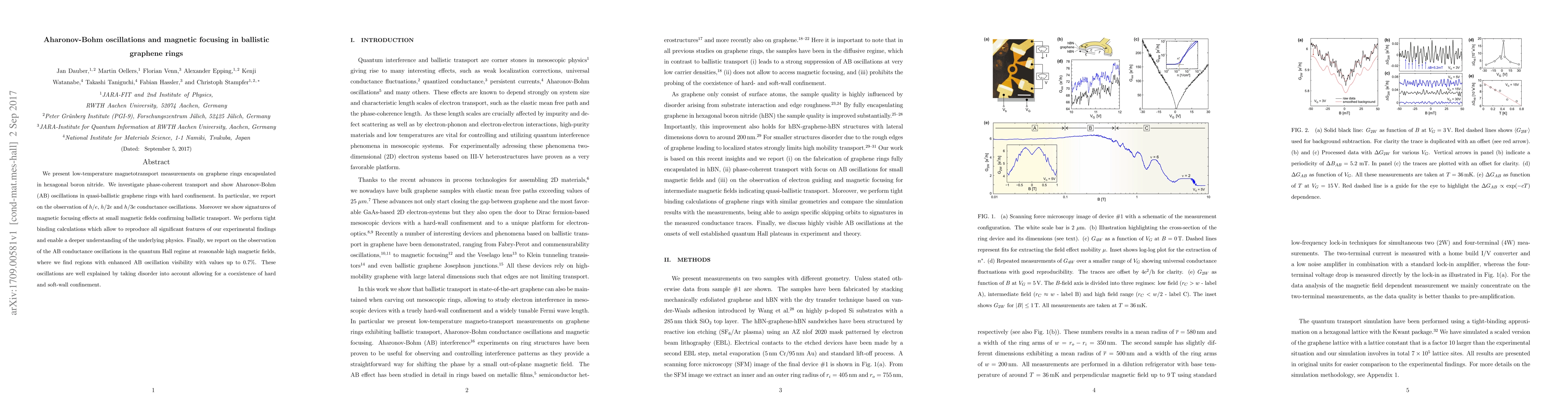 This study investigates magnetotransport in quasi-ballistic graphene rings, revealing Aharonov-Bohm oscillations and magnetic focusing effects, with observed conductance oscillations at $h/e$, $h/2e$, and $h/3e$. Tight-binding calculations corroborate experimental findings, and enhanced visibility of AB oscillations in the quantum Hall regime is attributed to disorder effects.