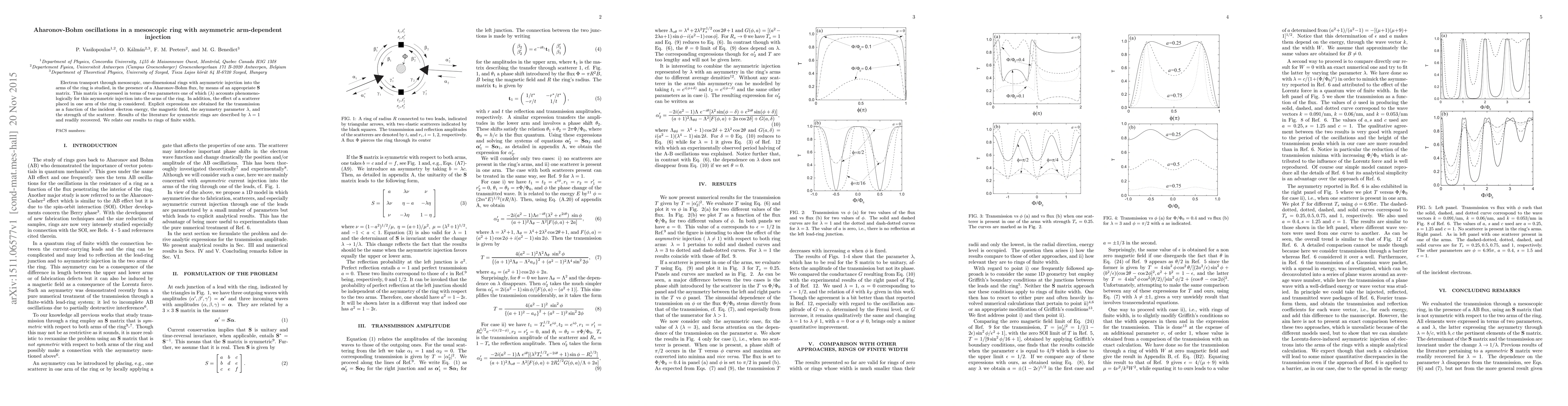 This research paper studies electron transport in a mesoscopic ring with asymmetric arm-dependent injection under an Aharonov-Bohm flux, providing explicit expressions for transmission as a function of energy, magnetic field, asymmetry parameter, and scatterer strength.
