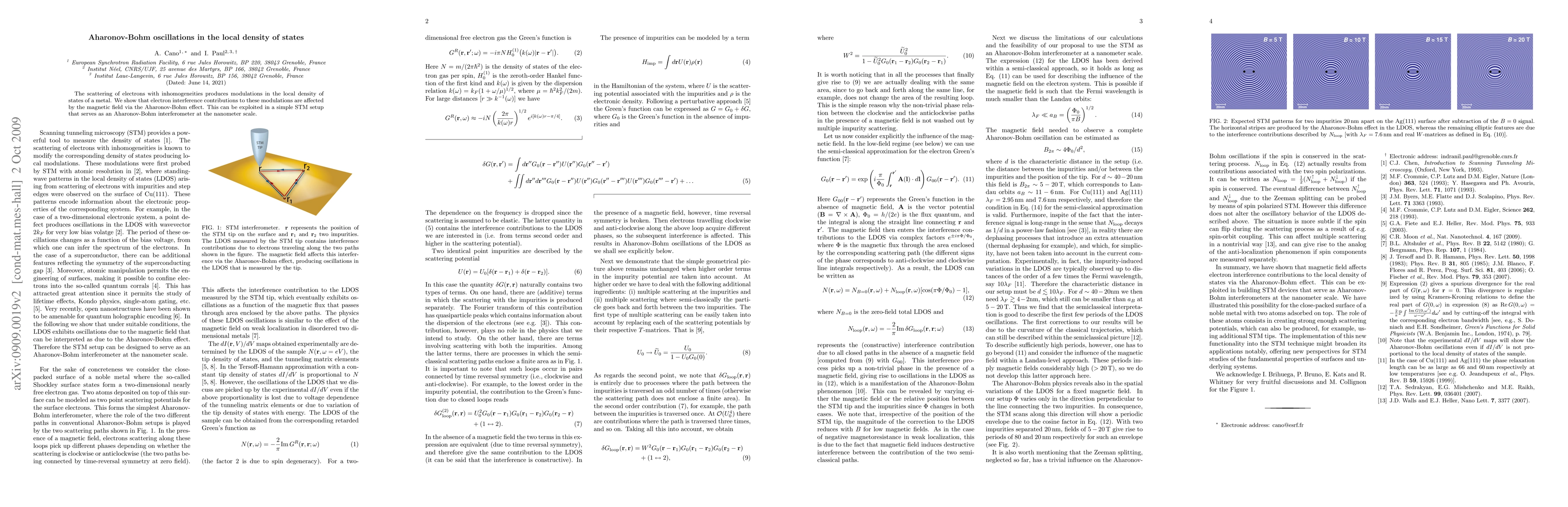 The paper investigates how electron interference in scattering processes modulates the local density of states in metals, revealing the Aharonov-Bohm effect's influence on these modulations. A simple STM setup is proposed to observe these nanoscale Aharonov-Bohm oscillations.