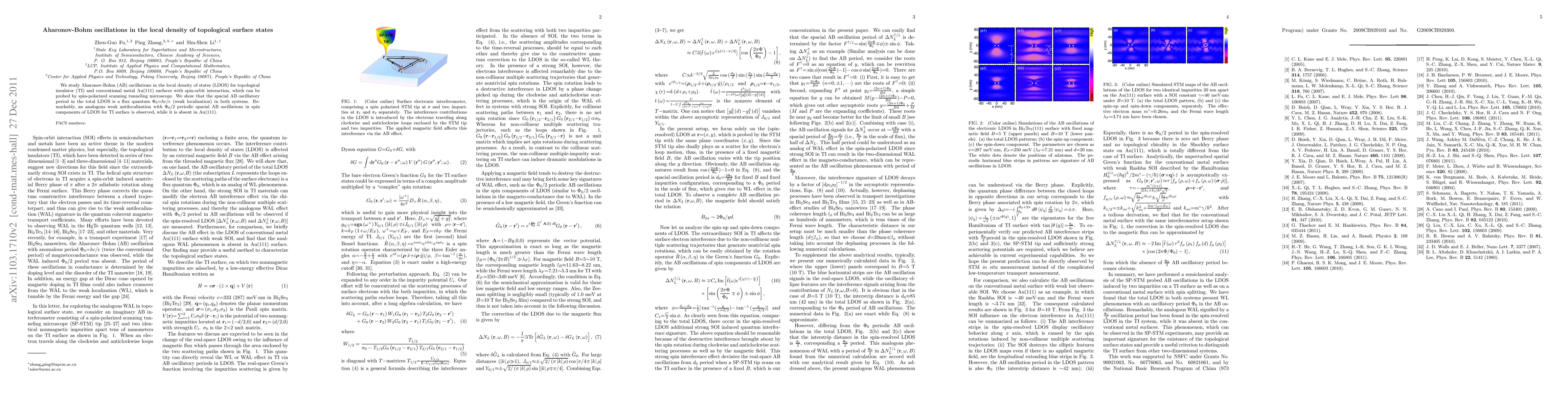 This study investigates Aharonov-Bohm oscillations in the local density of states (LDOS) on topological insulator and conventional metal surfaces, revealing a flux quantum period in both. Notably, topological insulators show weak antilocalization with half-flux quantum period oscillations in spin components, absent in the metal.