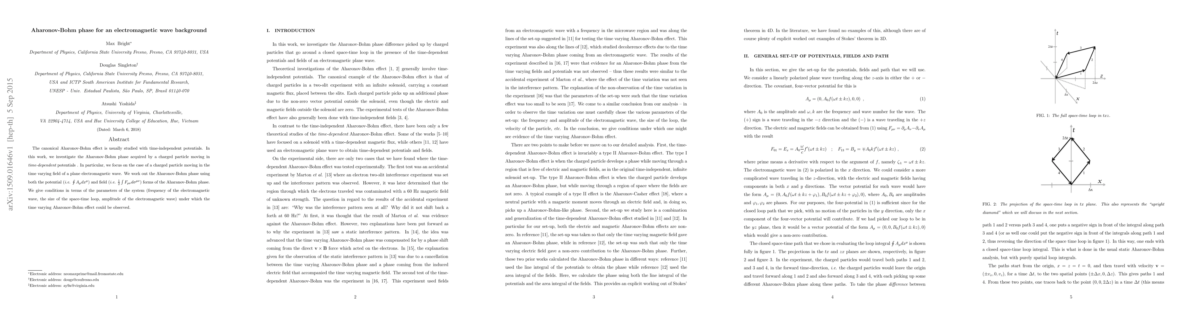 This paper investigates the Aharonov-Bohm phase for a charged particle in time-dependent electromagnetic potentials, specifically in the varying field of a plane wave. It derives the phase using both potential and field formulations and identifies conditions for observing the time-varying Aharonov-Bohm effect.