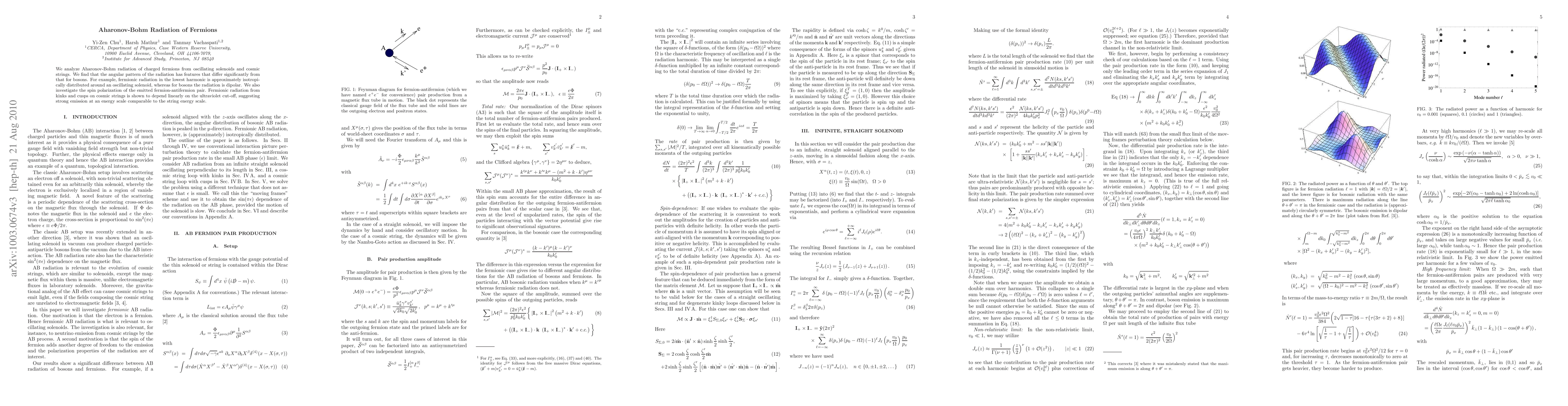 This study reveals distinct angular patterns in Aharonov-Bohm radiation of charged fermions compared to bosons, with fermionic radiation from oscillating solenoids being isotropic, while bosonic radiation is dipolar. Additionally, fermion-antifermion pairs from cosmic strings exhibit spin polarization and strong emission dependent on the ultraviolet cut-off.