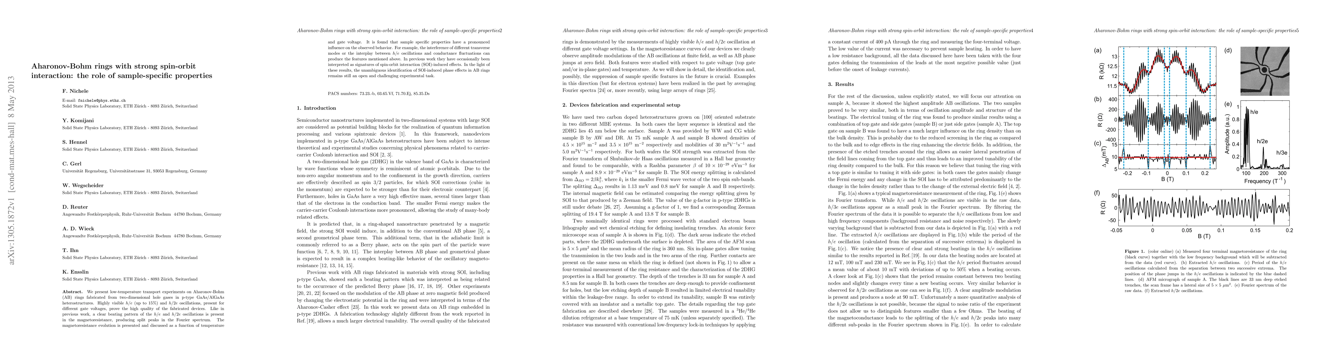 We present low-temperature transport experiments on Aharonov-Bohm (AB) rings fabricated from two-dimensional hole gases in p-type GaAs/AlGaAs heterostructures. Highly visible h/e (up to 15%) and h/2e oscillations, present for different gate voltages, prove the high quality of the fabricated devices. Like in previous work, a clear beating pattern of the h/e and h/2e oscillations is present in the magnetoresistance, producing split peaks in the Fourier spectrum. The magnetoresistance evolution is presented and discussed as a function of temperature and gate voltage. It is found that sample specific properties have a pronounced influence on the observed behavior. For example, the interference of different transverse modes or the interplay between h/e oscillations and conductance fluctuations can produce the features mentioned above. In previous work they have occasionally been interpreted as signatures of spin-orbit interaction (SOI)-induced effects. In the light of these results, the unambiguous identification of SOI-induced phase effects in AB rings remains still an open and challenging experimental task.
