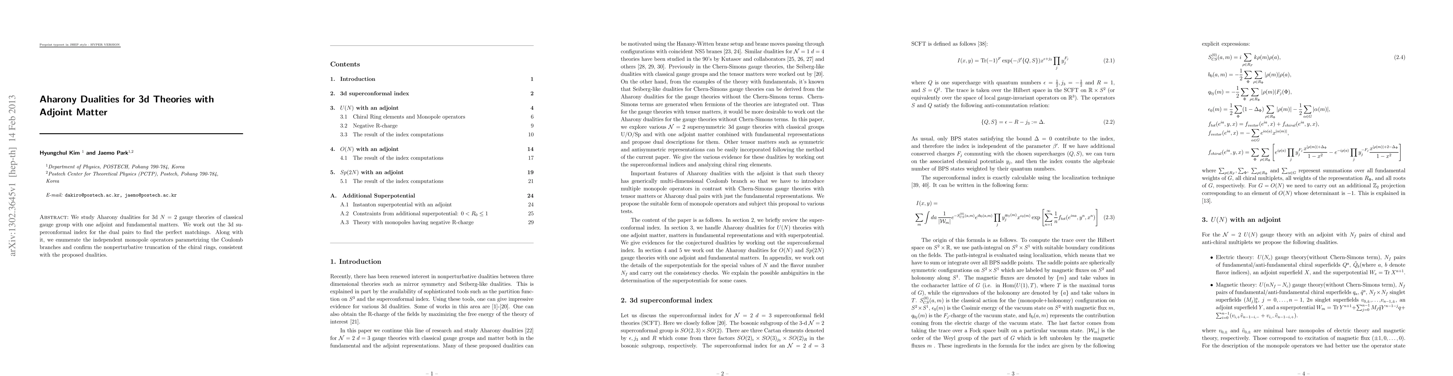 We study Aharony dualities for 3d N=2 gauge theories of classical gauge group with one adjoint and fundamental matters. We work out the 3d superconformal index for the dual pairs to find the perfect matchings. Along with it, we enumerate the independent monopole operators parametrizing the Coulomb branches and confirm the nonperturbative truncation of the chiral rings, consistent with the proposed dualities.