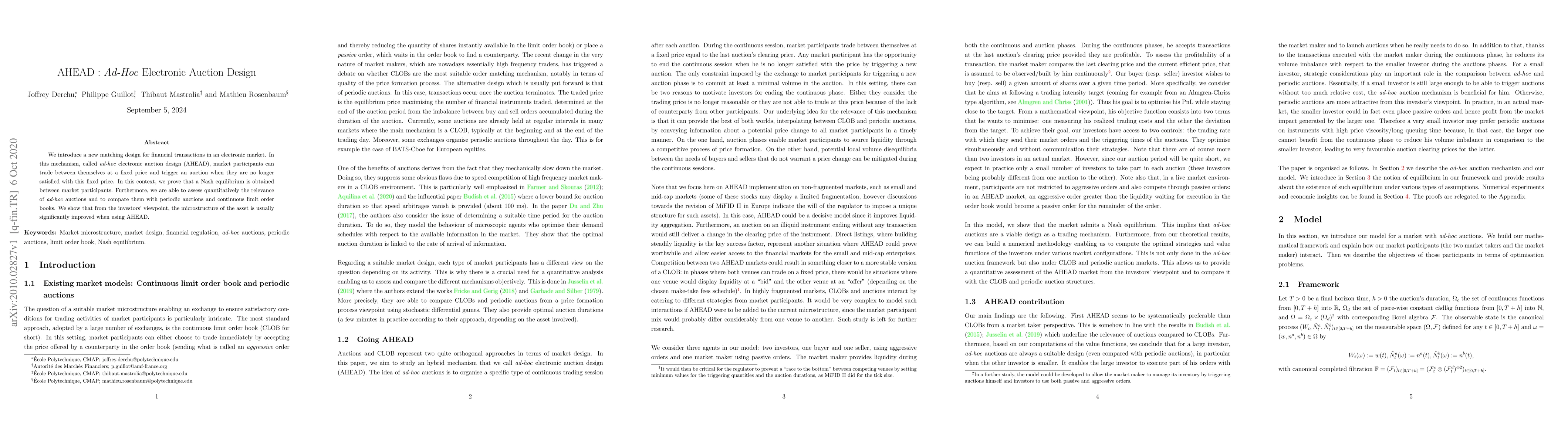 This paper introduces AHEAD, a novel electronic auction design for financial markets where participants can trade at a fixed price and initiate auctions when dissatisfied. The study demonstrates that AHEAD achieves a Nash equilibrium and shows that it often improves asset microstructure compared to periodic auctions and continuous limit order books.