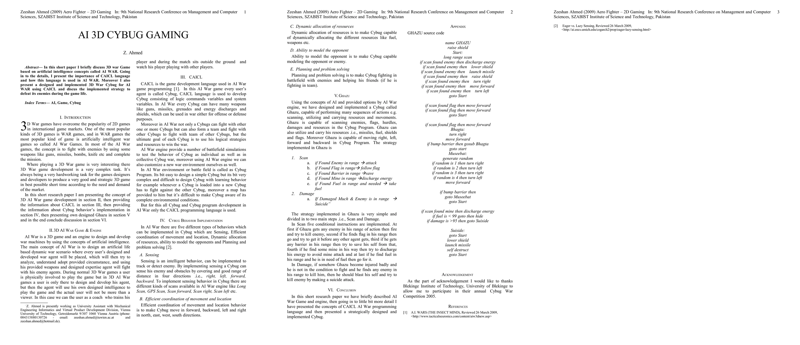 In this short paper I briefly discuss 3D war Game based on artificial intelligence concepts called AI WAR. Going in to the details, I present the importance of CAICL language and how this language is used in AI WAR. Moreover I also present a designed and implemented 3D War Cybug for AI WAR using CAICL and discus the implemented strategy to defeat its enemies during the game life.