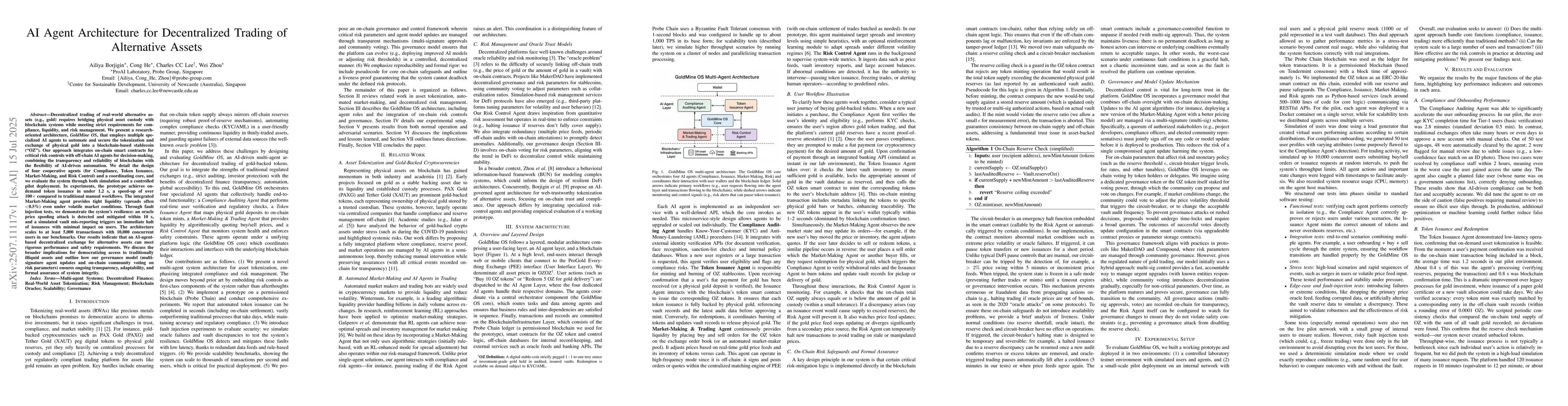 Decentralized trading of real-world alternative assets (e.g., gold) requires bridging physical asset custody with blockchain systems while meeting strict requirements for compliance, liquidity, and risk management. We present GoldMine OS, a research oriented architecture that employs multiple specialized AI agents to automate and secure the tokenization and exchange of physical gold into a blockchain based stablecoin ("OZ"). Our approach combines on chain smart contracts for critical risk controls with off chain AI agents for decision making, blending the transparency and reliability of blockchains with the flexibility of AI driven automation. We describe four cooperative agents (Compliance, Token Issuance, Market Making, and Risk Control) and a coordinating core, and evaluate the system through simulation and a controlled pilot deployment. In experiments the prototype delivers on demand token issuance in under 1.2 s, more than 100 times faster than manual workflows. The Market Making agent maintains tight liquidity with spreads often below 0.5 percent even under volatile conditions. Fault injection tests show resilience: an oracle price spoofing attack is detected and mitigated within 10 s, and a simulated vault mis reporting halts issuance immediately with minimal user impact. The architecture scales to 5000 transactions per second with 10000 concurrent users in benchmarks. These results indicate that an AI agent based decentralized exchange for alternative assets can satisfy rigorous performance and safety requirements. We discuss broader implications for democratizing access to traditionally illiquid assets and explain how our governance model -- multi signature agent updates and on chain community voting on risk parameters -- provides ongoing transparency, adaptability, and formal assurance of system integrity.
