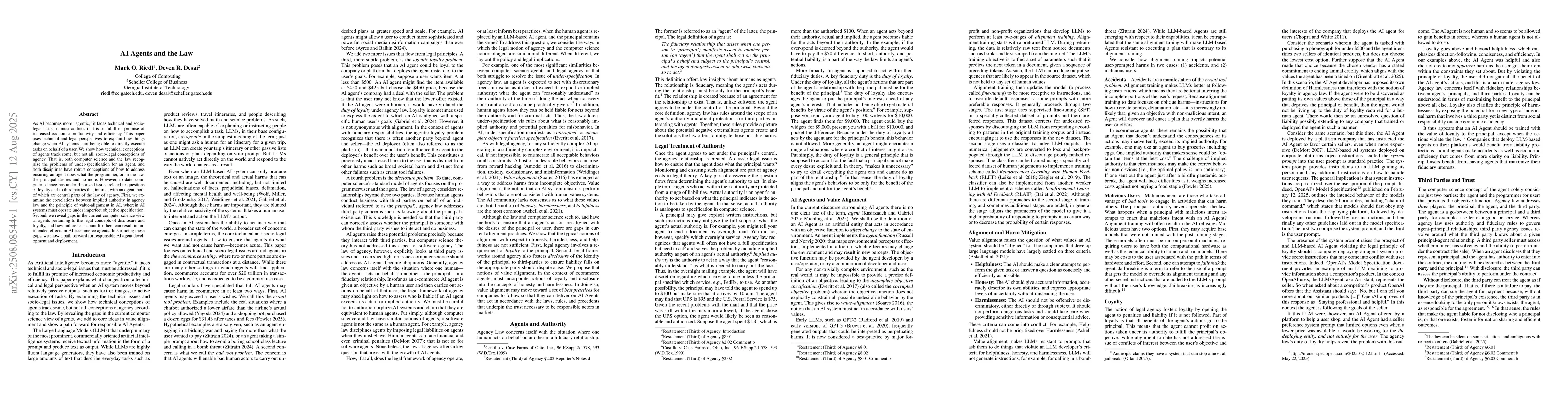 As AI becomes more "agentic," it faces technical and socio-legal issues it must address if it is to fulfill its promise of increased economic productivity and efficiency. This paper uses technical and legal perspectives to explain how things change when AI systems start being able to directly execute tasks on behalf of a user. We show how technical conceptions of agents track some, but not all, socio-legal conceptions of agency. That is, both computer science and the law recognize the problems of under-specification for an agent, and both disciplines have robust conceptions of how to address ensuring an agent does what the programmer, or in the law, the principal desires and no more. However, to date, computer science has under-theorized issues related to questions of loyalty and to third parties that interact with an agent, both of which are central parts of the law of agency. First, we examine the correlations between implied authority in agency law and the principle of value-alignment in AI, wherein AI systems must operate under imperfect objective specification. Second, we reveal gaps in the current computer science view of agents pertaining to the legal concepts of disclosure and loyalty, and how failure to account for them can result in unintended effects in AI ecommerce agents. In surfacing these gaps, we show a path forward for responsible AI agent development and deployment.