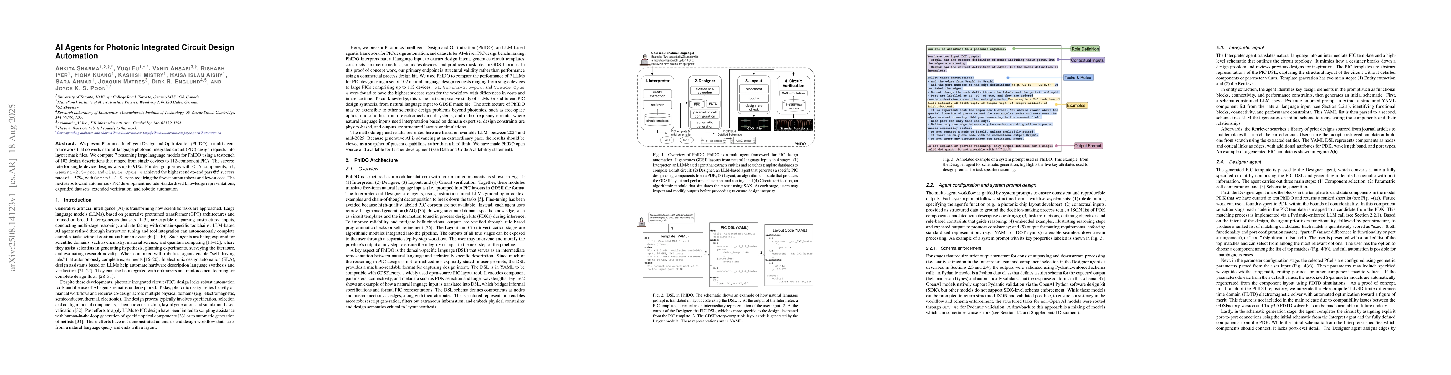 We present Photonics Intelligent Design and Optimization (PhIDO), a multi-agent framework that converts natural-language photonic integrated circuit (PIC) design requests into layout mask files. We compare 7 reasoning large language models for PhIDO using a testbench of 102 design descriptions that ranged from single devices to 112-component PICs. The success rate for single-device designs was up to 91%. For design queries with less than or equal to 15 components, o1, Gemini-2.5-pro, and Claude Opus 4 achieved the highest end-to-end pass@5 success rates of approximately 57%, with Gemini-2.5-pro requiring the fewest output tokens and lowest cost. The next steps toward autonomous PIC development include standardized knowledge representations, expanded datasets, extended verification, and robotic automation.