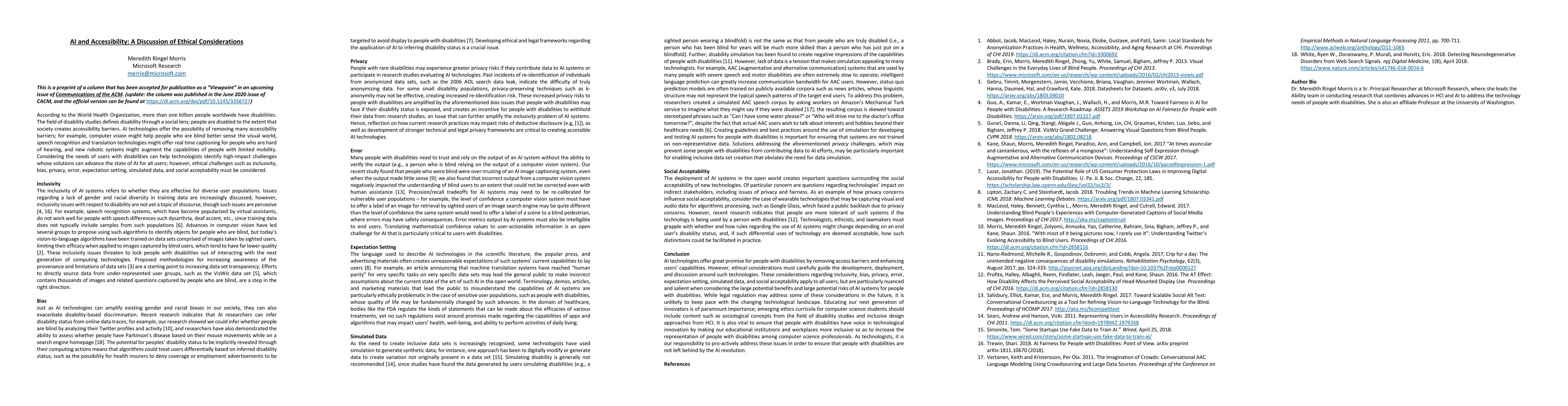 This paper discusses the potential of AI technologies to improve accessibility for people with disabilities, highlighting benefits such as enhanced sensory perception and communication. However, it also raises ethical concerns including inclusivity, bias, privacy, and social acceptability that must be addressed to ensure equitable AI advancements.
