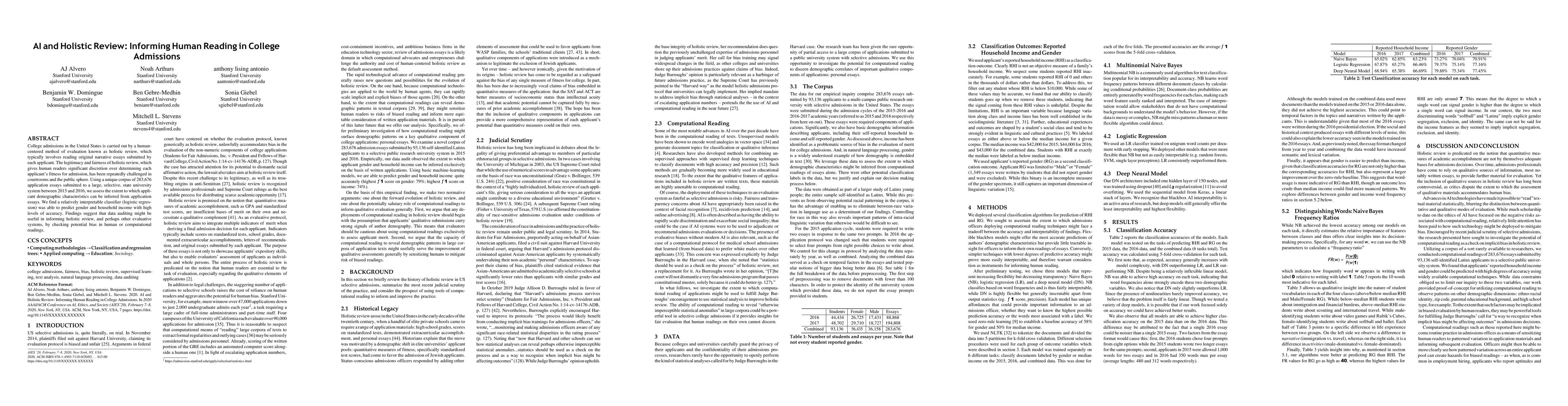 College admissions in the United States is carried out by a human-centered method of evaluation known as holistic review, which typically involves reading original narrative essays submitted by each applicant. The legitimacy and fairness of holistic review, which gives human readers significant discretion over determining each applicant's fitness for admission, has been repeatedly challenged in courtrooms and the public sphere. Using a unique corpus of 283,676 application essays submitted to a large, selective, state university system between 2015 and 2016, we assess the extent to which applicant demographic characteristics can be inferred from application essays. We find a relatively interpretable classifier (logistic regression) was able to predict gender and household income with high levels of accuracy. Findings suggest that data auditing might be useful in informing holistic review, and perhaps other evaluative systems, by checking potential bias in human or computational readings.
