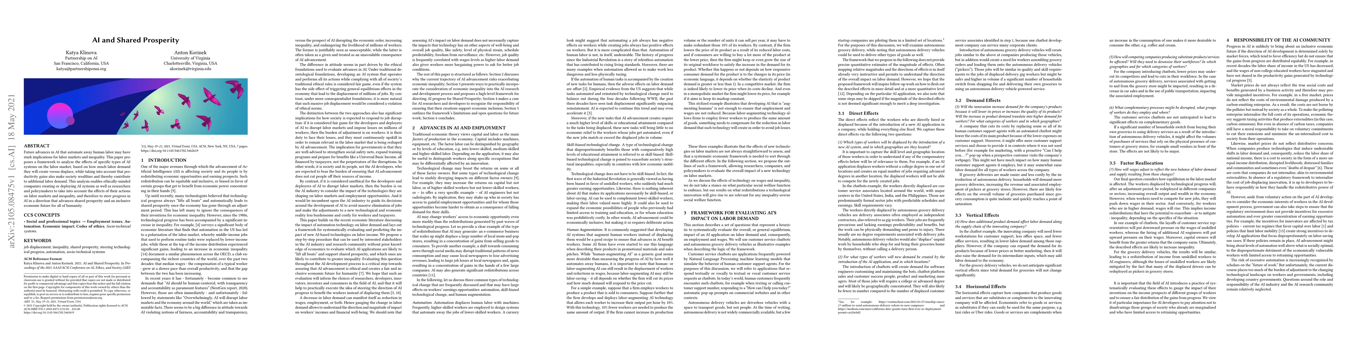 Future advances in AI that automate away human labor may have stark implications for labor markets and inequality. This paper proposes a framework to analyze the effects of specific types of AI systems on the labor market, based on how much labor demand they will create versus displace, while taking into account that productivity gains also make society wealthier and thereby contribute to additional labor demand. This analysis enables ethically-minded companies creating or deploying AI systems as well as researchers and policymakers to take into account the effects of their actions on labor markets and inequality, and therefore to steer progress in AI in a direction that advances shared prosperity and an inclusive economic future for all of humanity.
